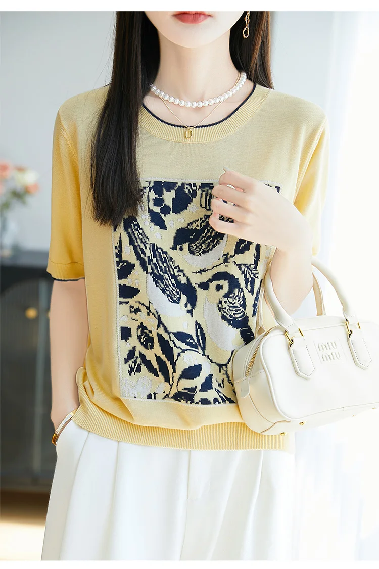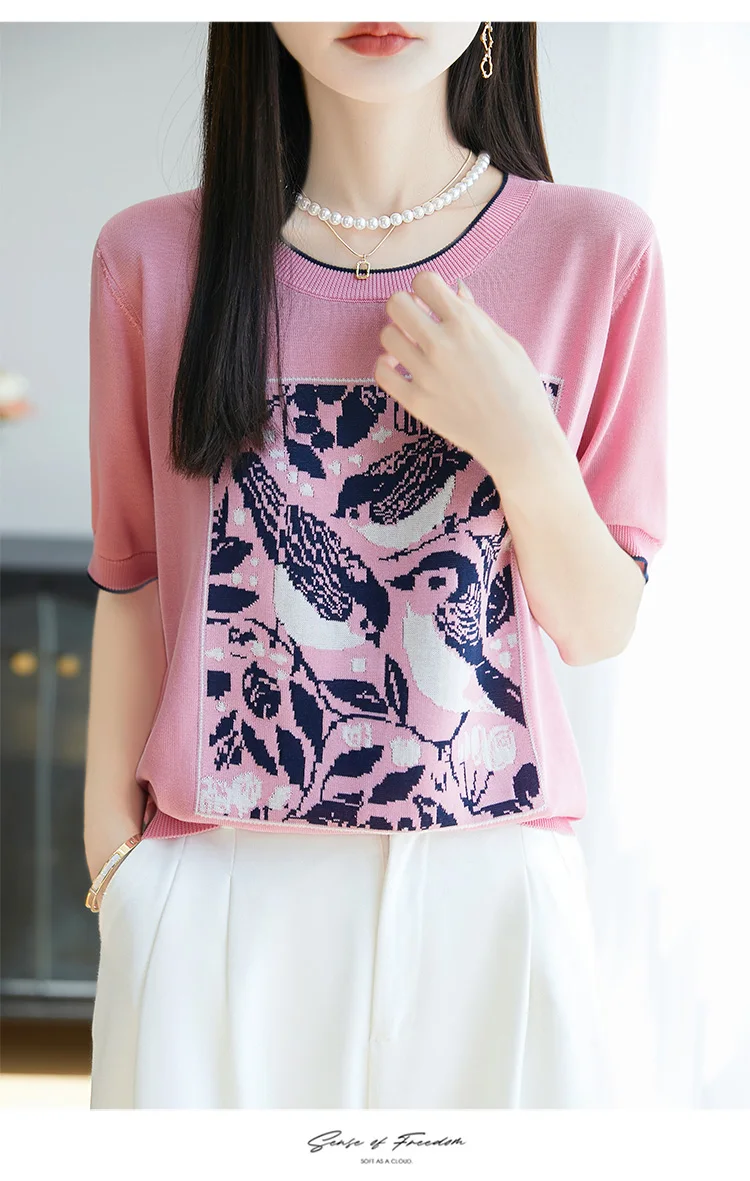 2025 été nouveau 100% Lyocell femmes à manches courtes décontracté col rond jacquard dessin animé T-shirt lâche hauts en tricot pull t-shirts cool