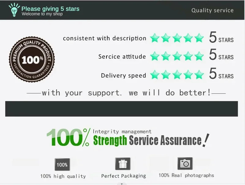 RETOUR D'INFORMATION1.Si vous êtes satisfait de nos produits et services, veuillez laisser vos commentaires positifs de 5 étoiles.Et 5 étoiles pour l'évaluation détaillée de votre commande.Bien sûr, nous donnerons vos commentaires positifs.2.Si nos produits ne sont pas satisfaits, veuillez nous contacter avant de laisser un commentaire négatif.Nous garantissons que nous résoudrons à 100 % tout problème pour vous.