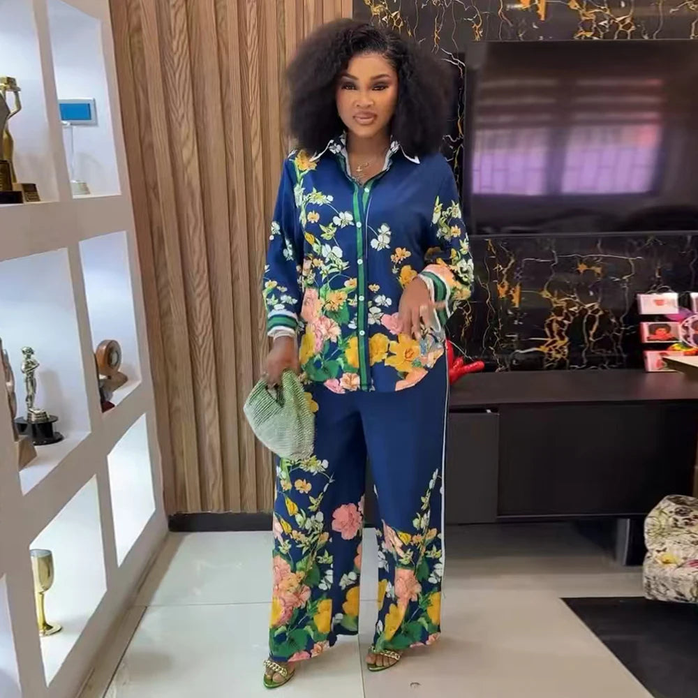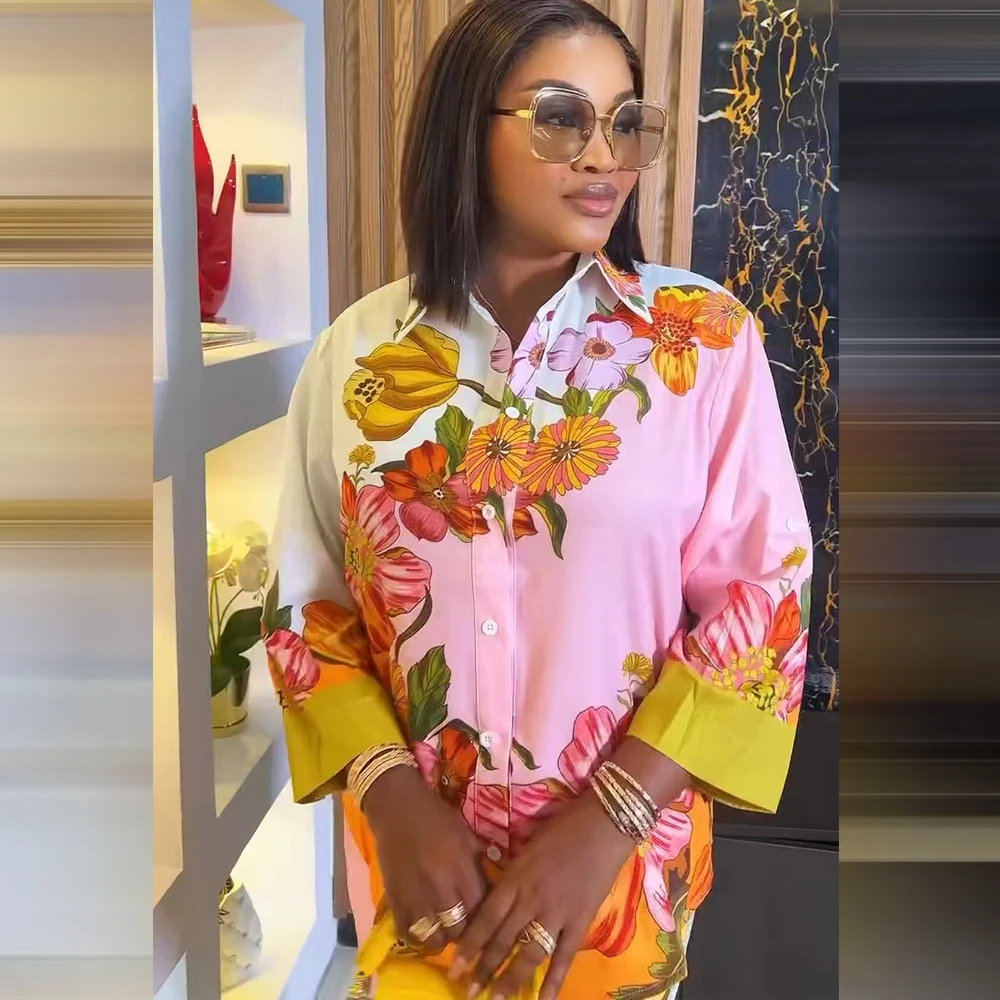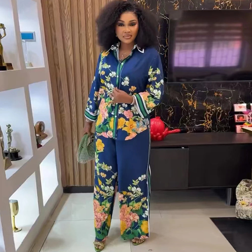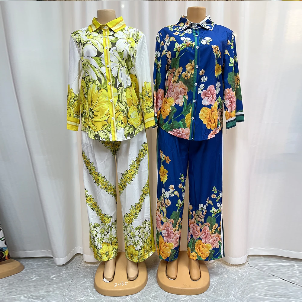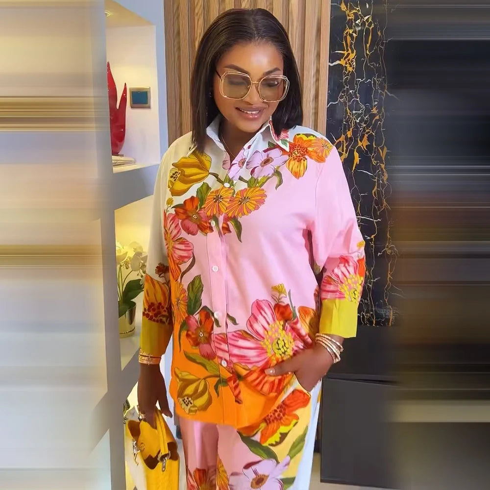 Chemise Vintage décontractée à imprimé Floral pour femmes, col rabattu, pantalon ample, chemisier, ensemble deux pièces, tenues de vacances printemps et été