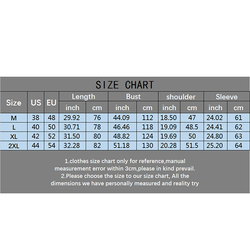XL Longueur: 31.5 Poitrine: 48.82 Manche: 24.8 Épaule: 19.68