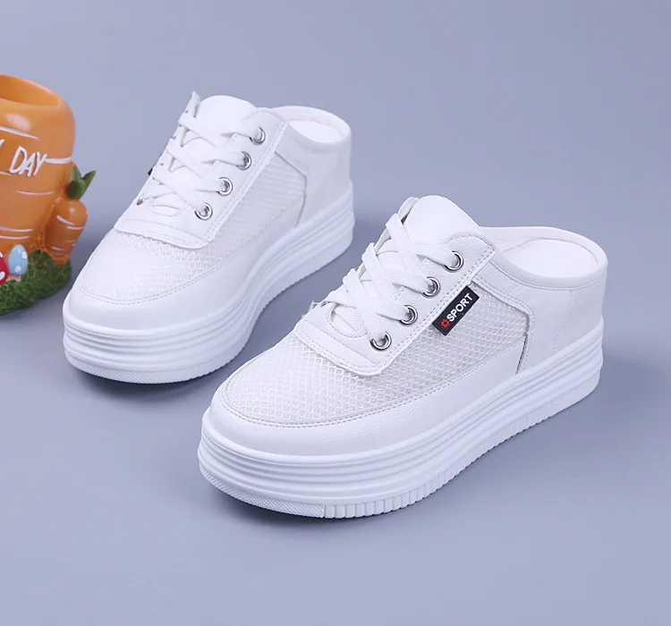 Demi-pantoufles en maille respirante pour femmes, surface évidée, os d'étudiant polyvalents, extérieur, Parker fermé, chaussure décontractée en maille, blanc, été