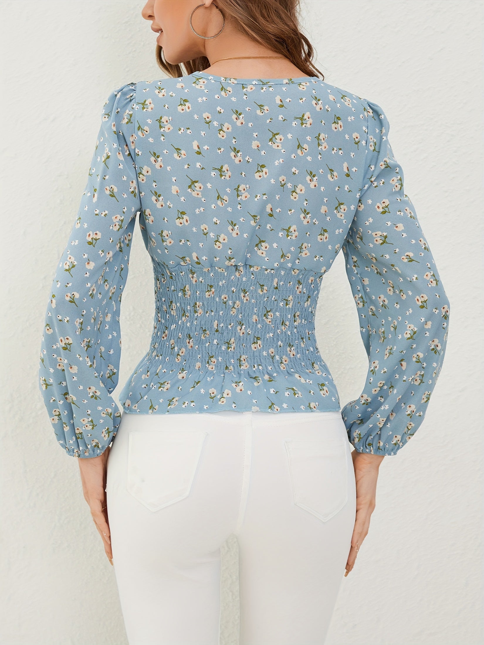Ditsy Floral Print Shirred Blouse, Elegant Long Sleeve V Neck Blouse, Women's Clothing