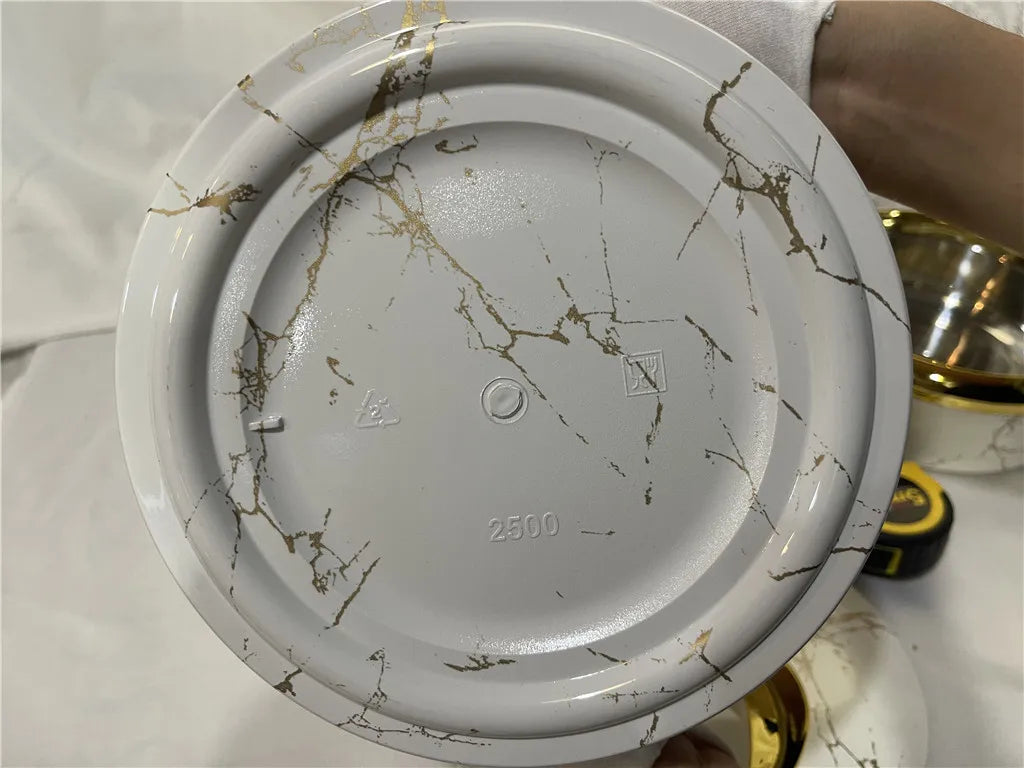 L'article est fait de plastique à l'extérieur avec du marbre et de couleur or, le poids est léger, pas lourd.