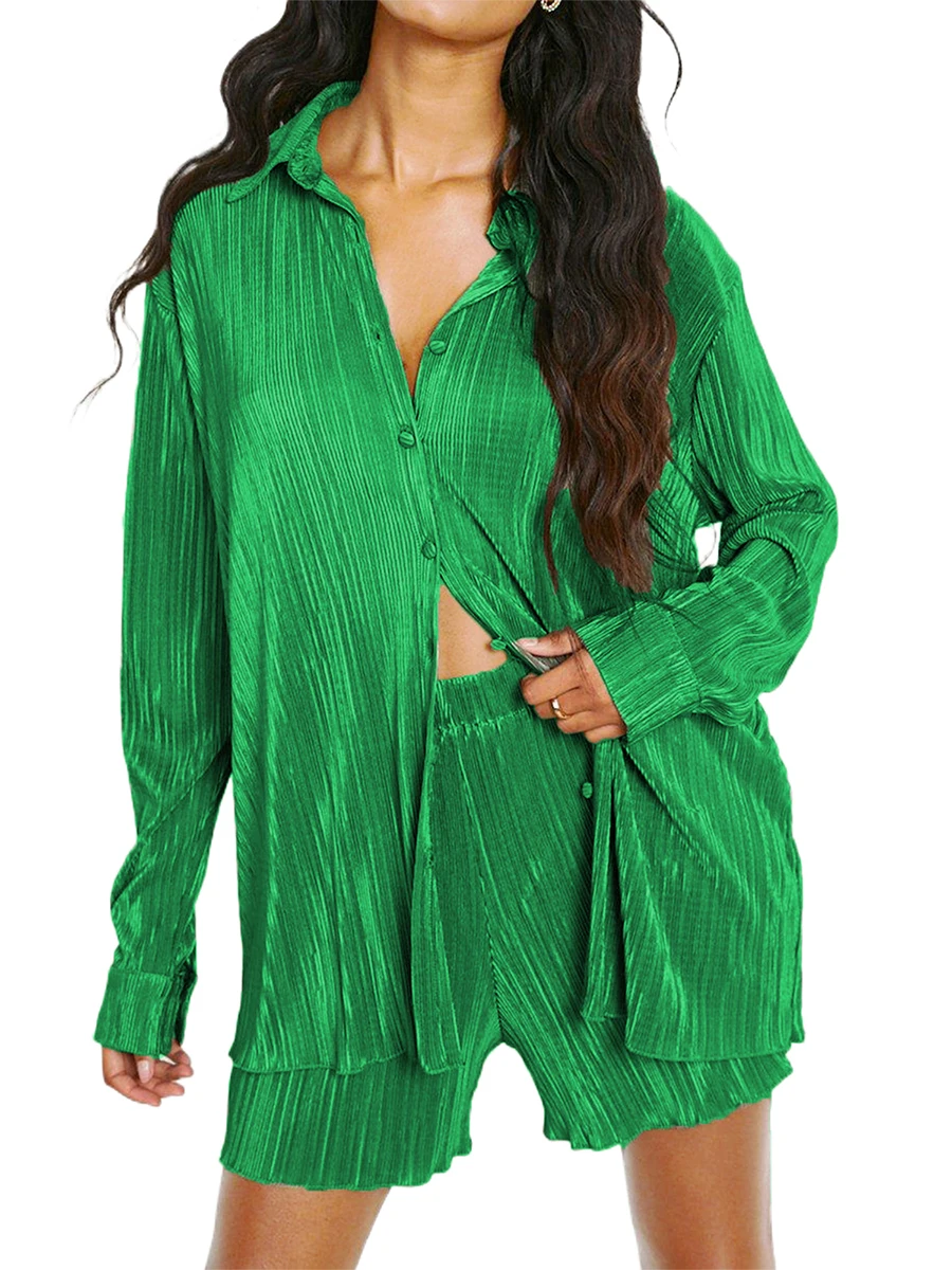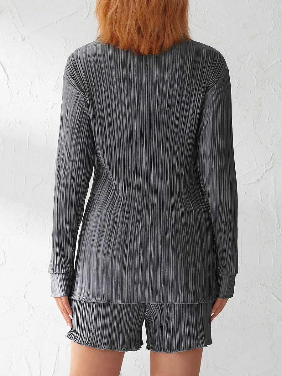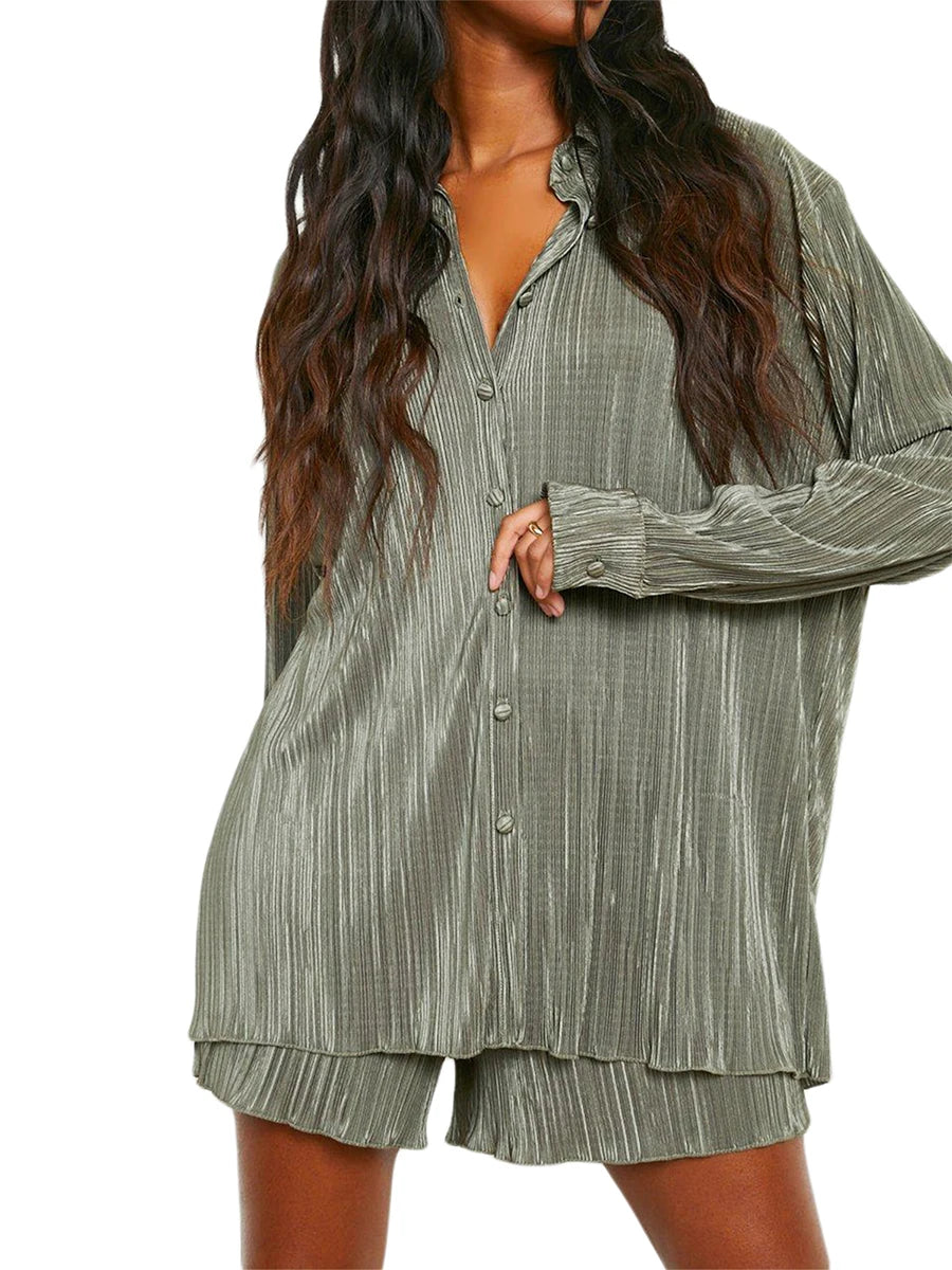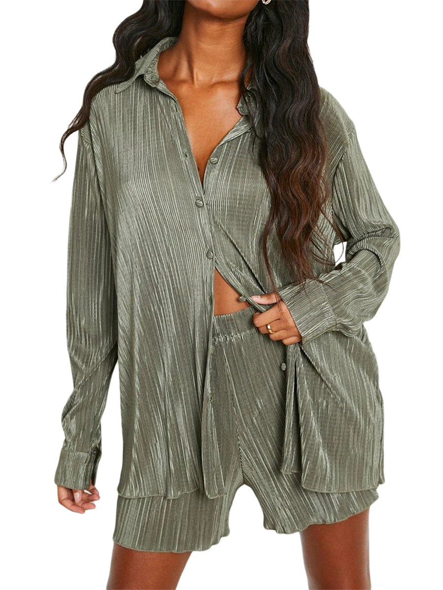 Ensemble de vêtements décontractés 2 pièces pour femmes Chemises boutonnées à manches longues et froncées de couleur unie avec short