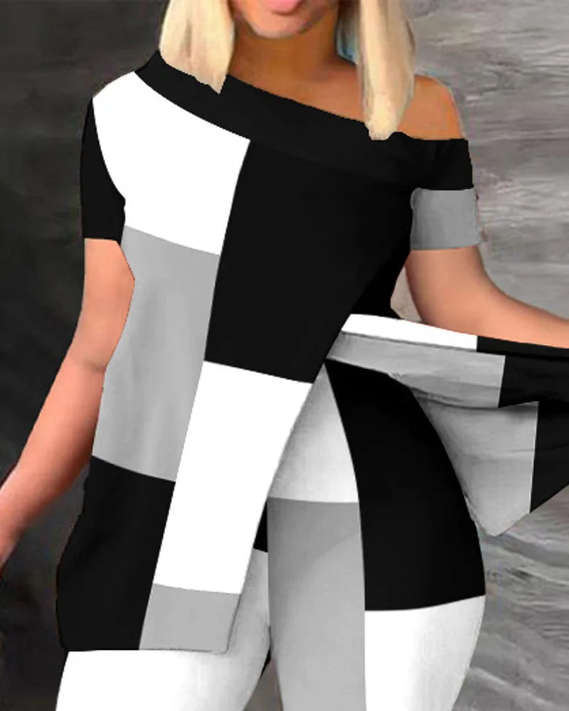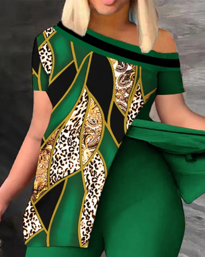 Ensemble deux pièces élégant pour femmes, nouvelle mode, imprimé, manches à volants, haut, pantalon de couleur unie, avec ceinture, chemisiers, vêtements féminins