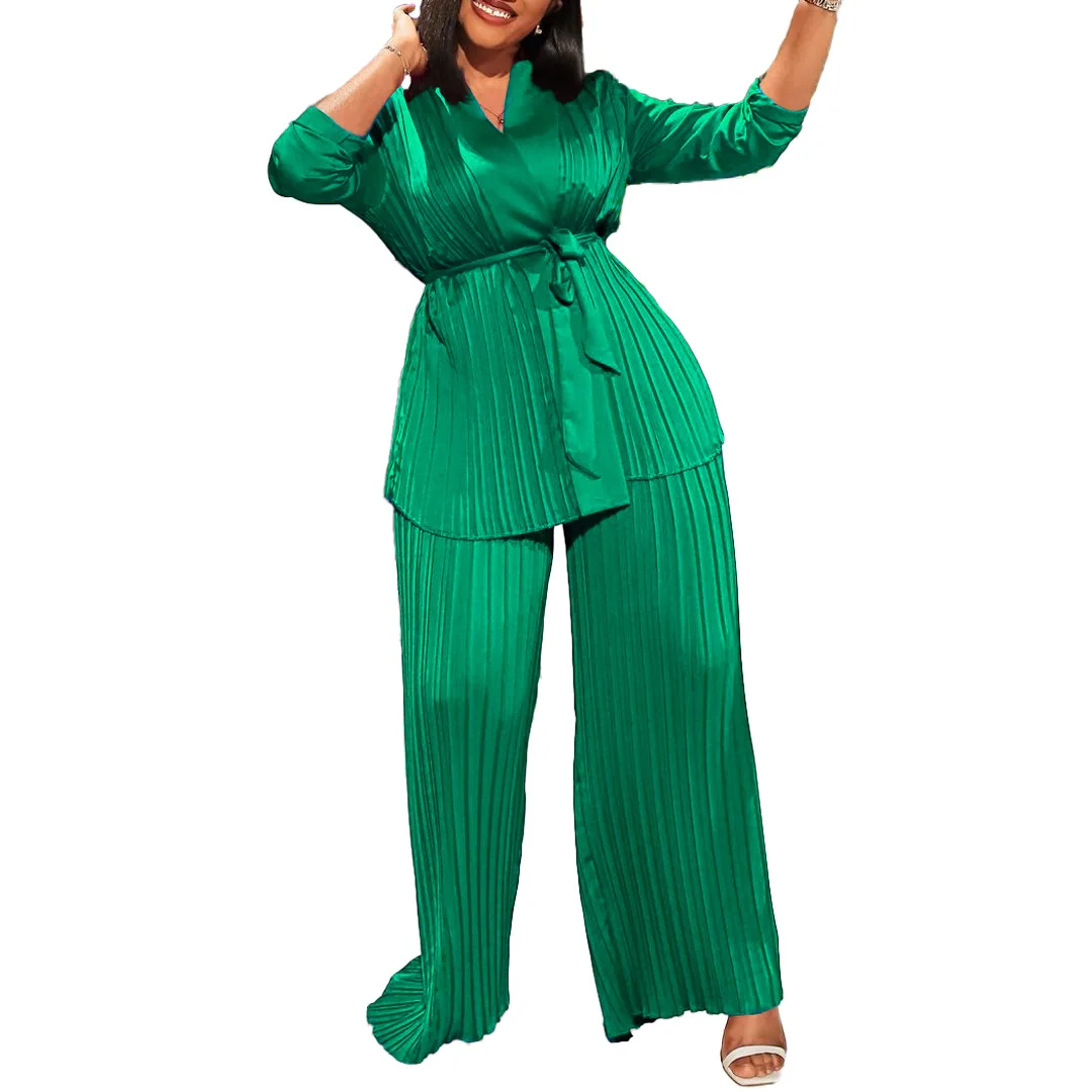 Ensemble deux pièces pour femmes africaines, mode d'été ample et plissé, chemise élégante à lacets OL, jambes larges, pantalon plissé