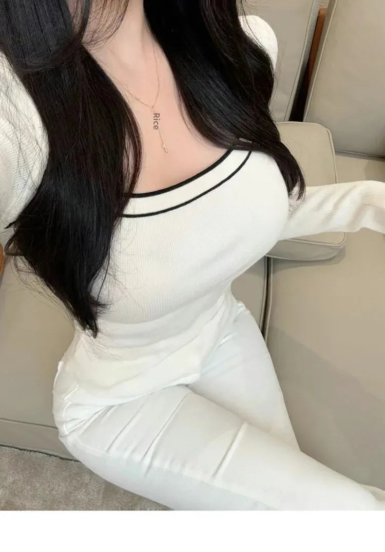 Français élégant bloc de couleur à manches longues chemise tricotée femmes col carré conception spectacle clavicule T-Shirt décontracté haut tendance