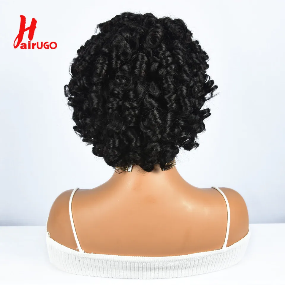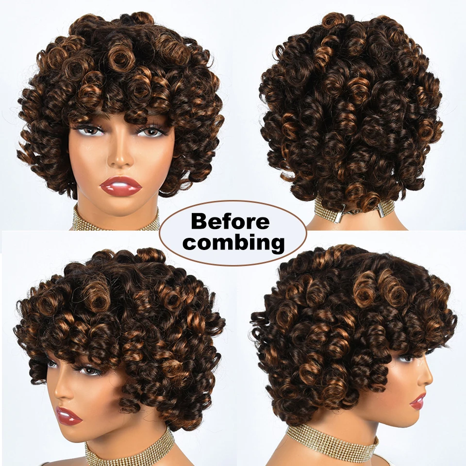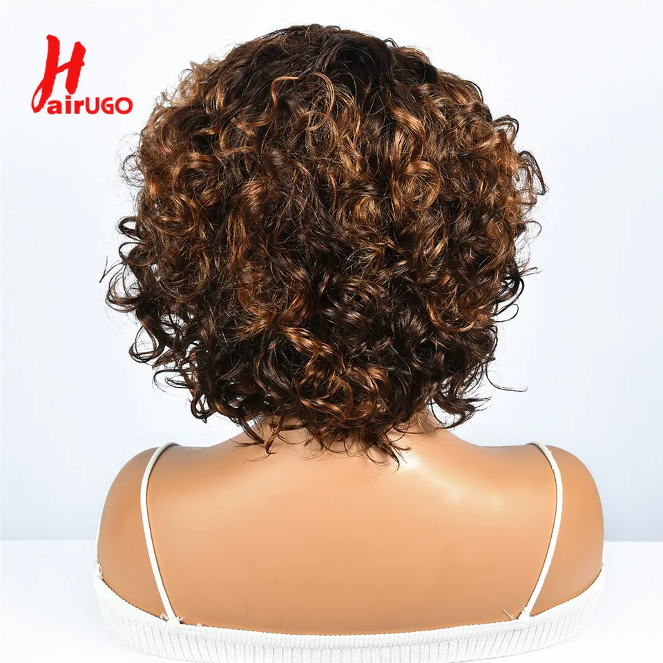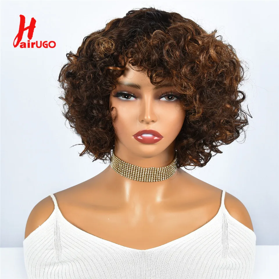 Hairugo-Perruque de Cheveux Humains Bouclés Coupe Pixie à Reflets, Sans Colle, avec Frange Entièrement Fabriquée à la Machine