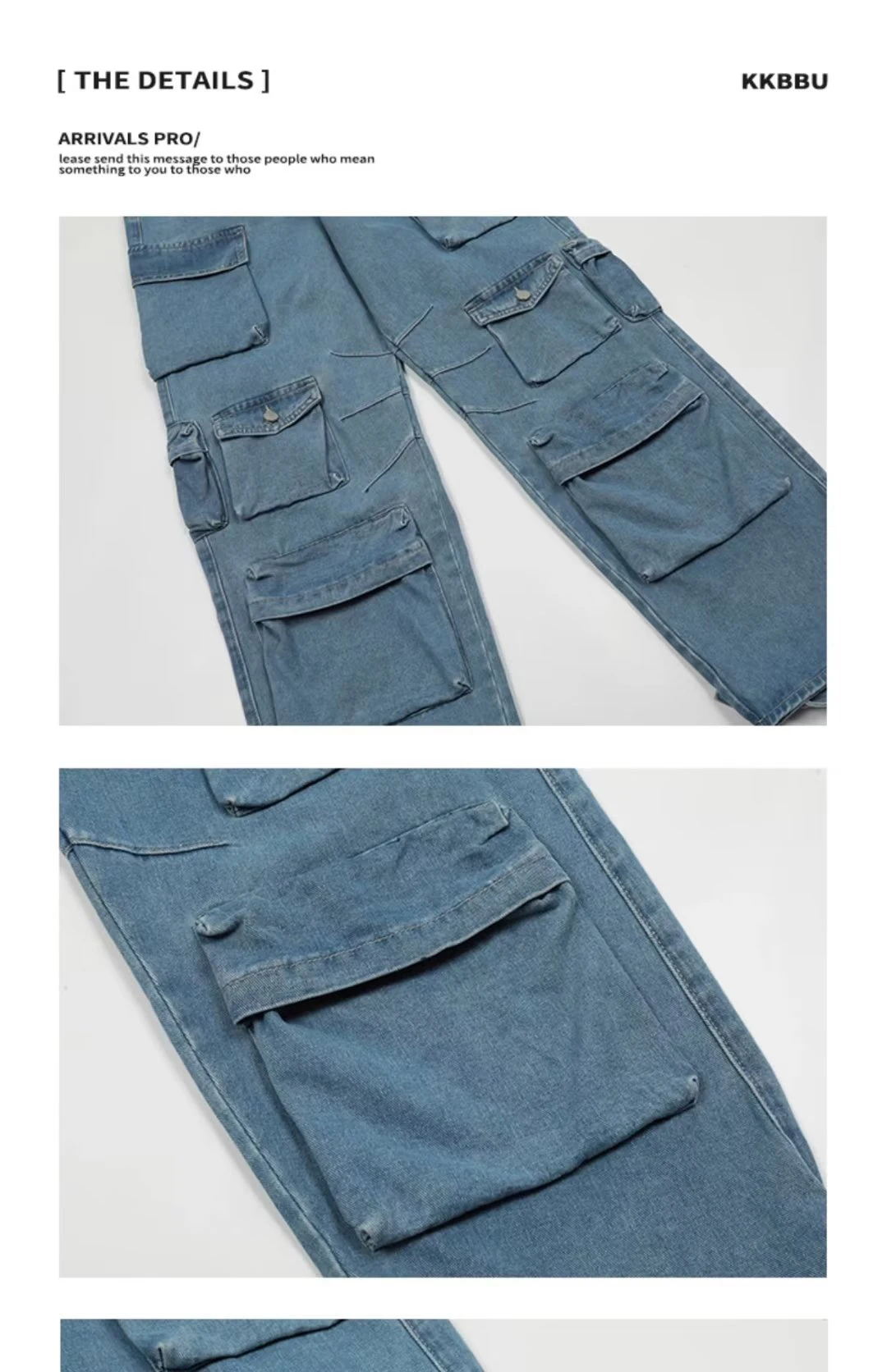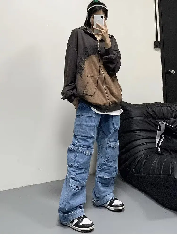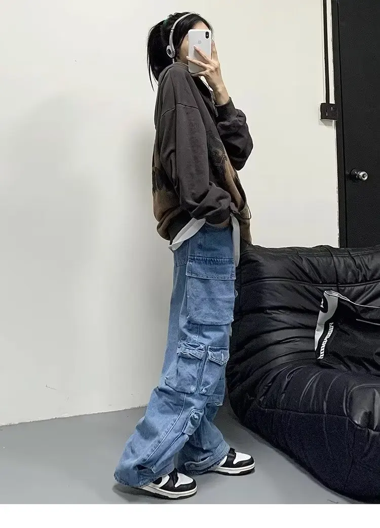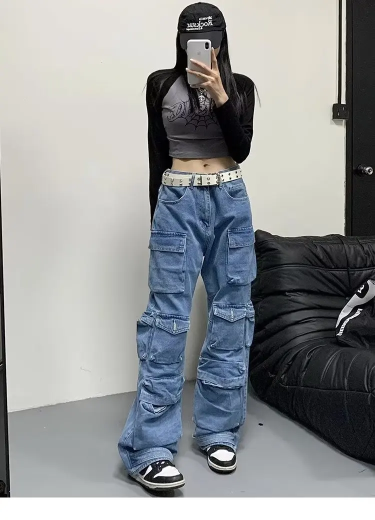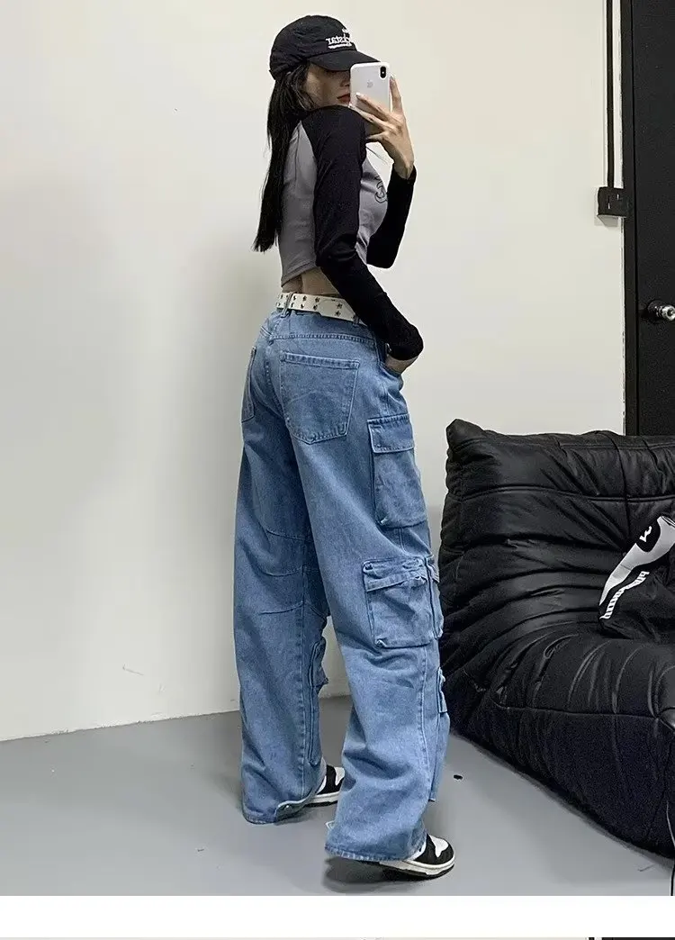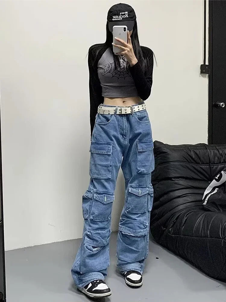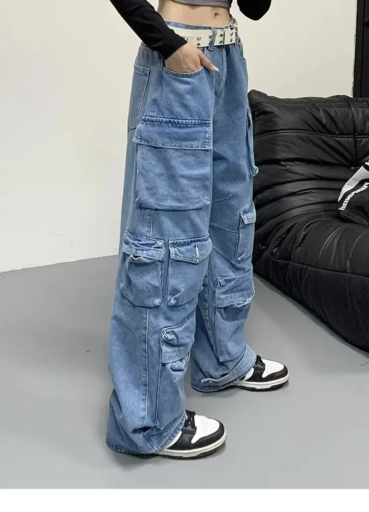 Jean Baggy à jambes larges pour femmes, pantalon Cargo multi-poches, nouvelle mode Harajuku Y2K, Streetwear, jean bleu délavé, 2025