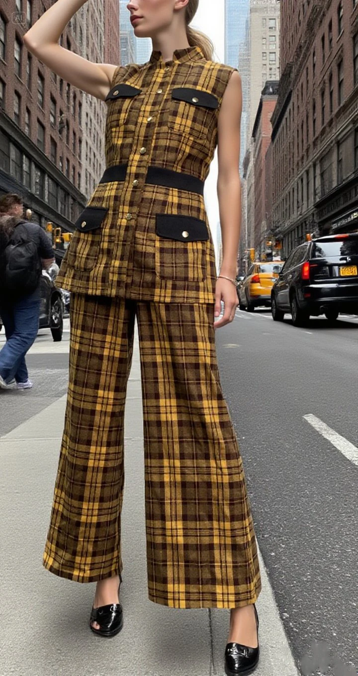 Krisstargirl 2 pièces ensembles tenue pour femmes été automne Plaid vêtements d'extérieur gilet haut pantalon à jambes larges correspondant costumes femme