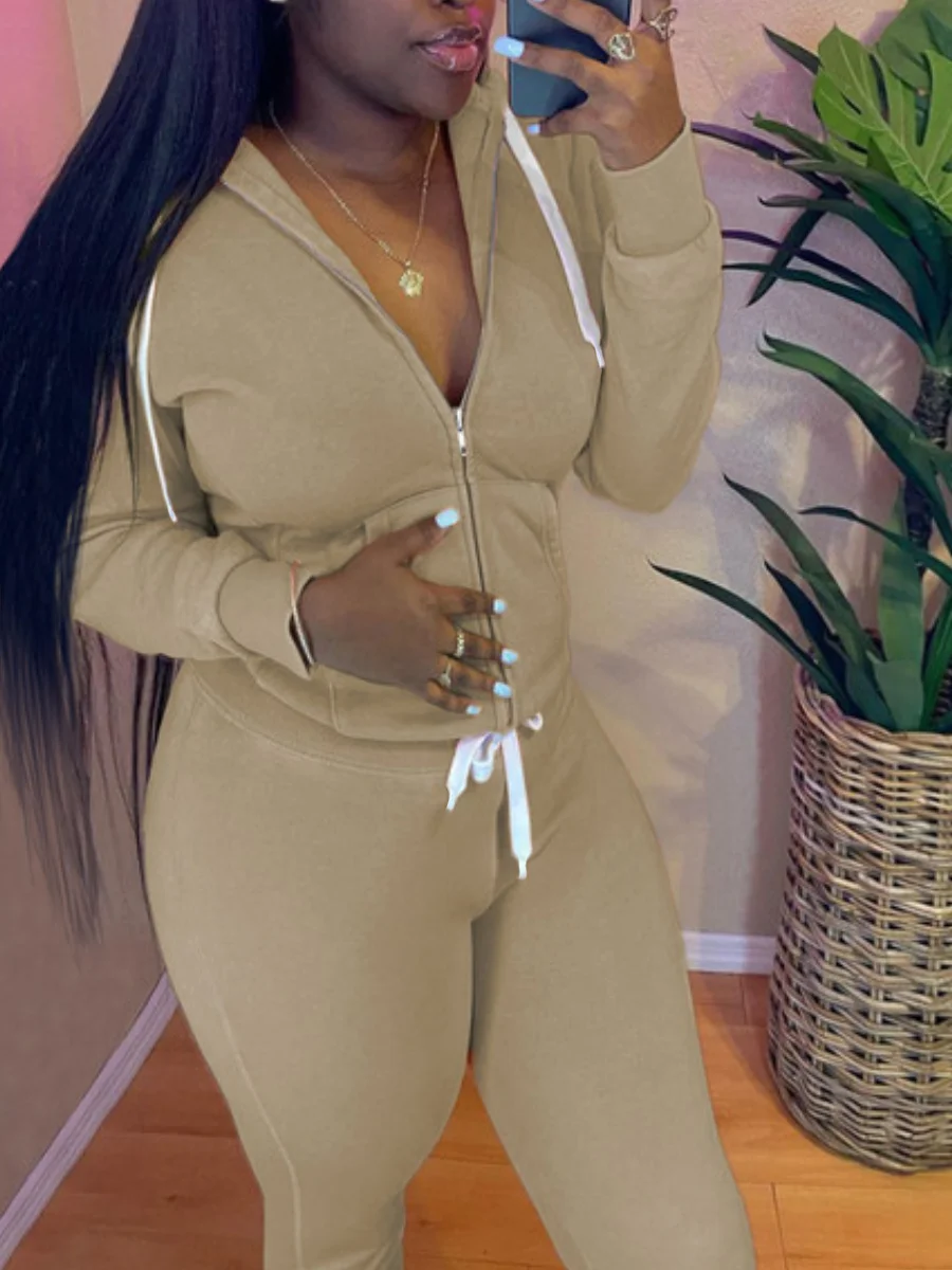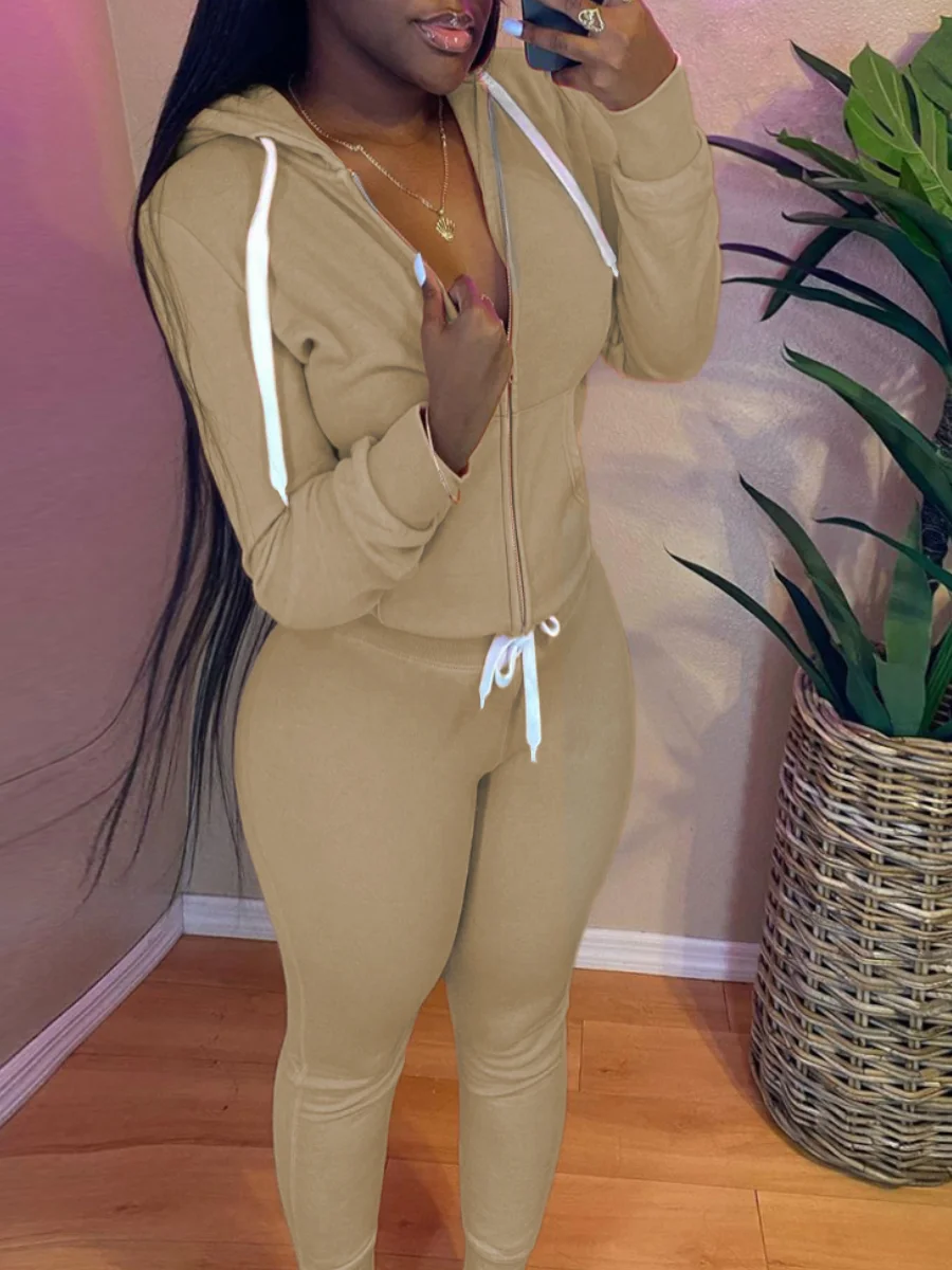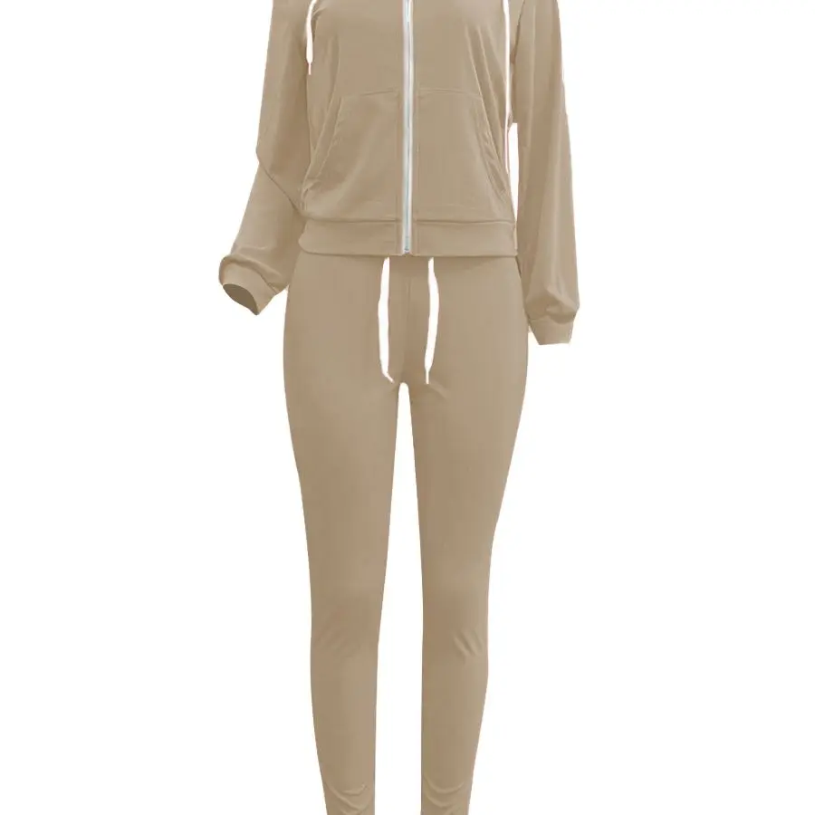 LW-Ensemble de survêtement à manches longues et cordon de serrage pour femme, poche kangourou décontractée, sweat à capuche et cordon de serrage, fjSpring, 2 pièces assorties