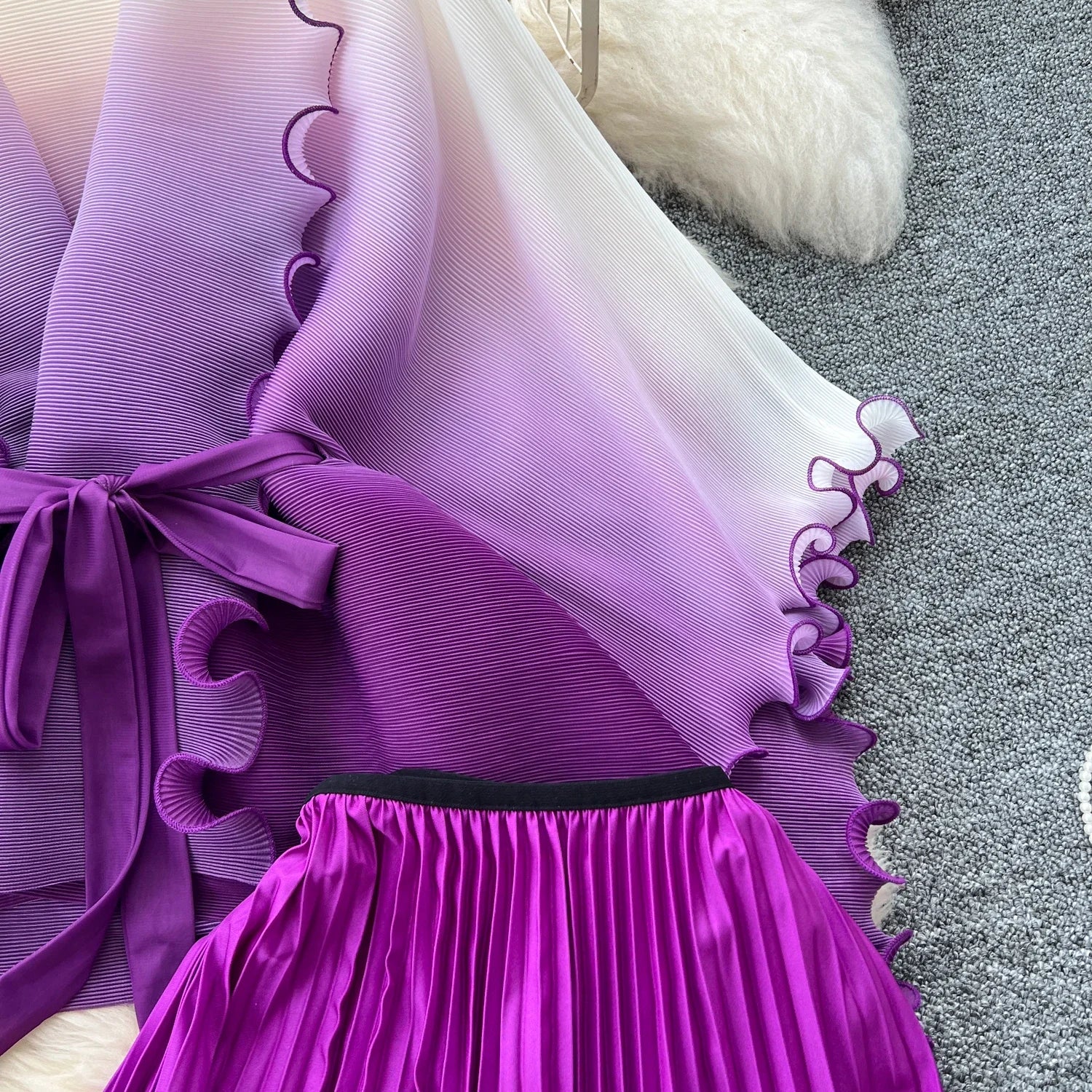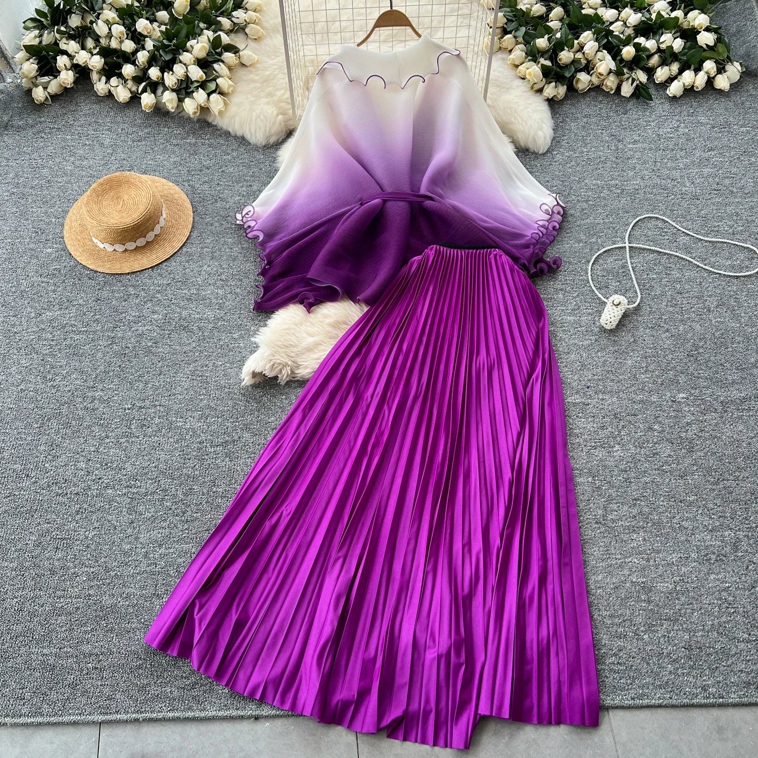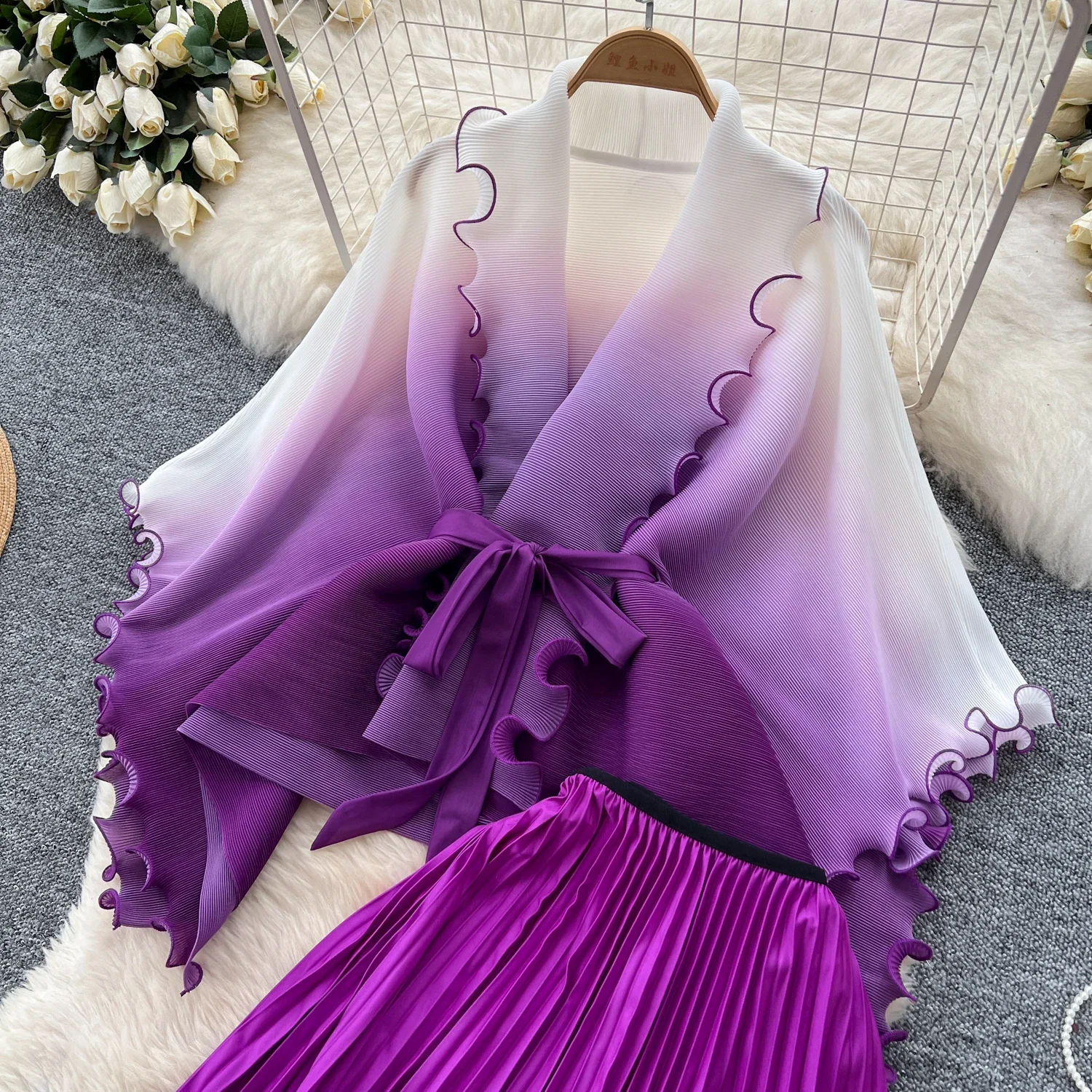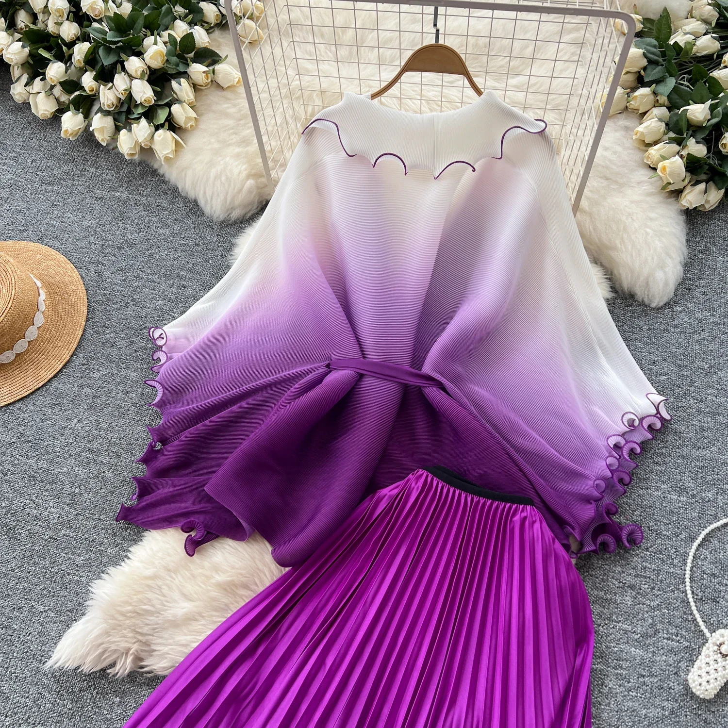 Miyake pli changement progressif couleur bord ondulé costume soleil jupe plissée à la mode et élégant deux pièces ensembles tenues pour femmes