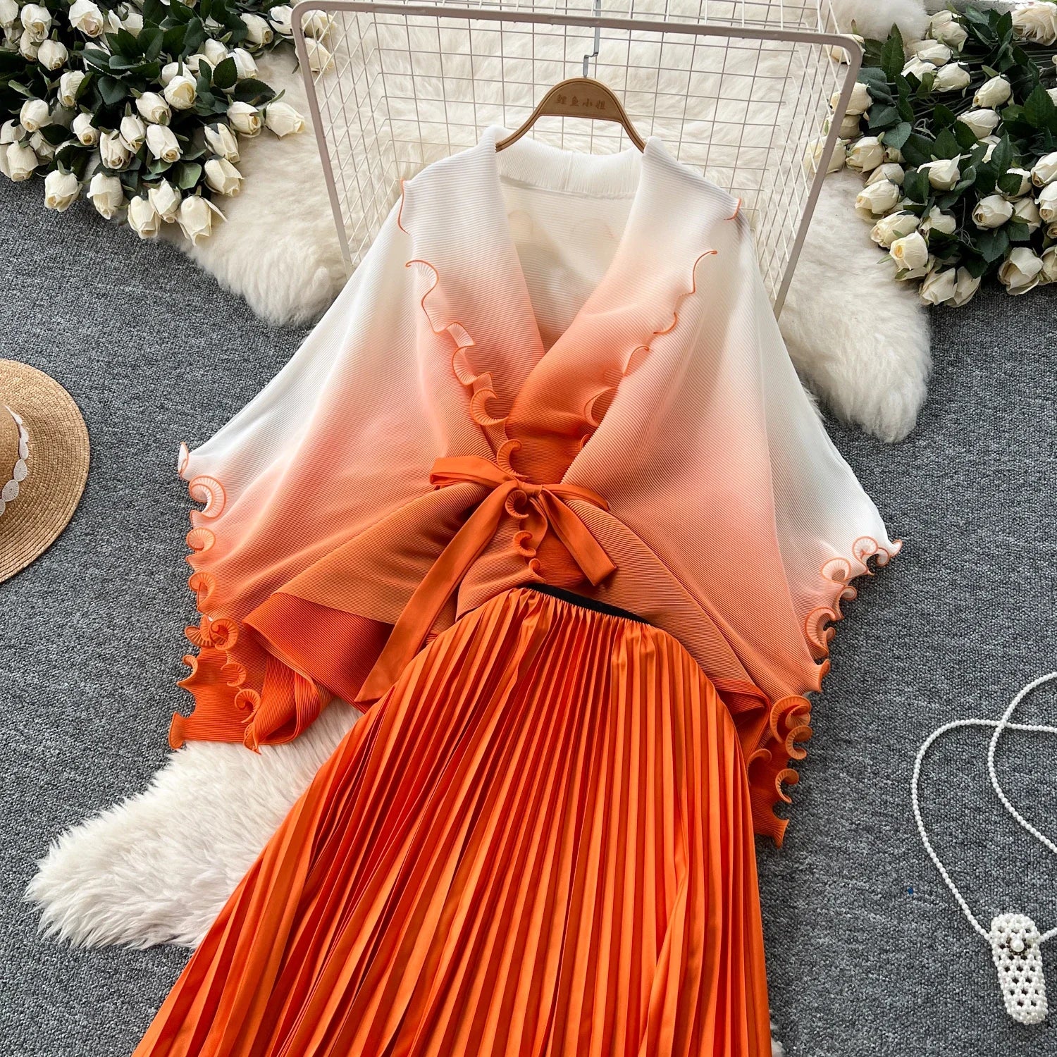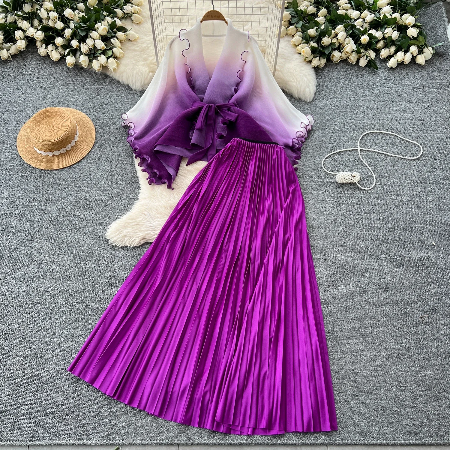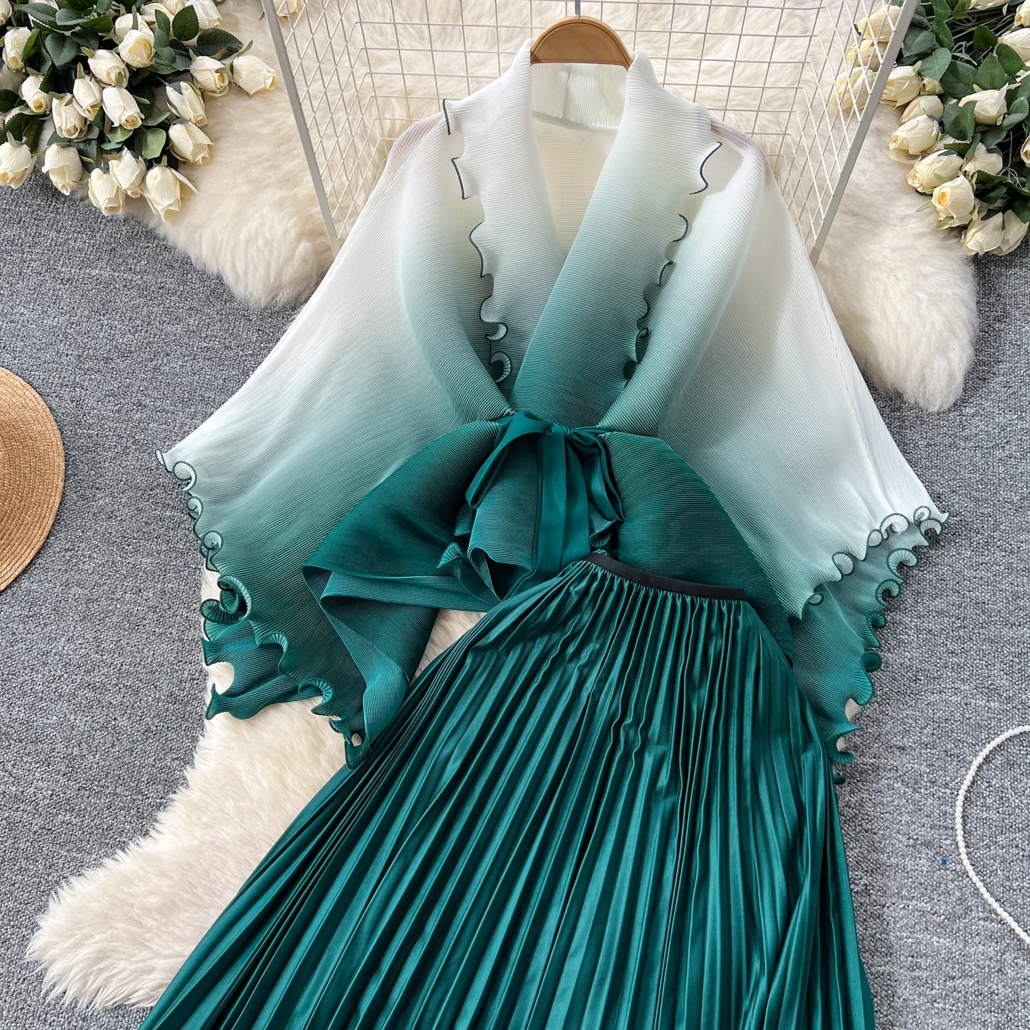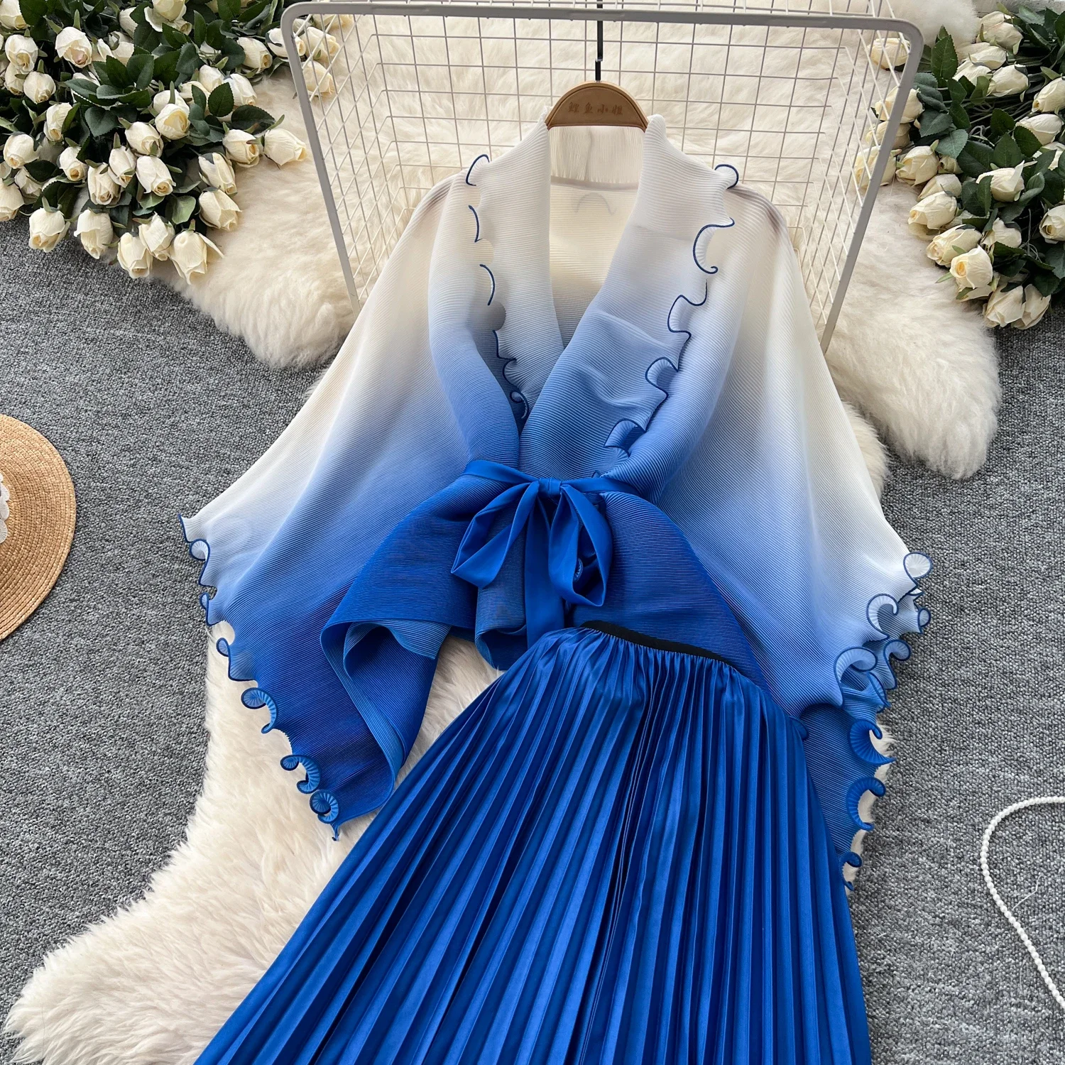 Miyake pli changement progressif couleur bord ondulé costume soleil jupe plissée à la mode et élégant deux pièces ensembles tenues pour femmes