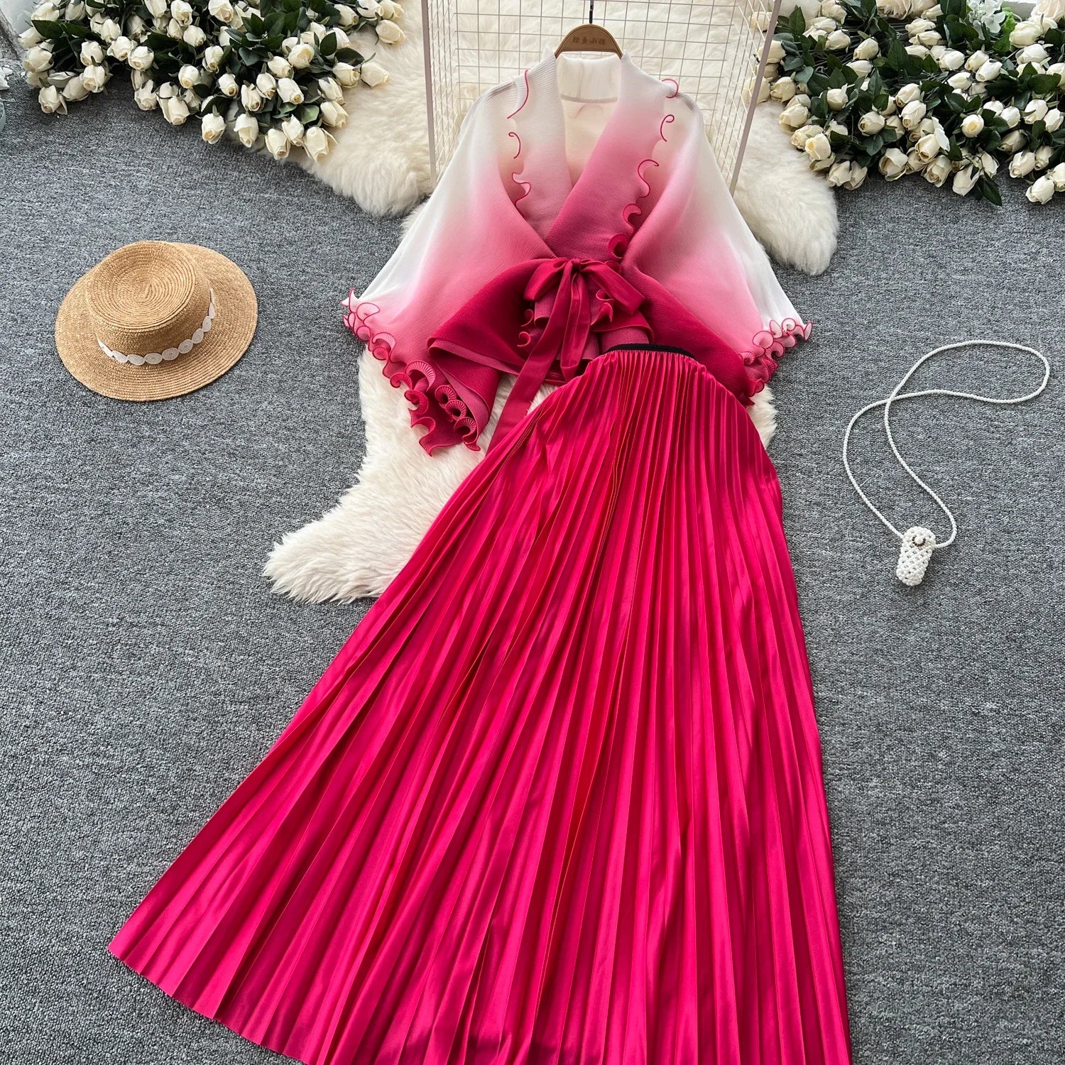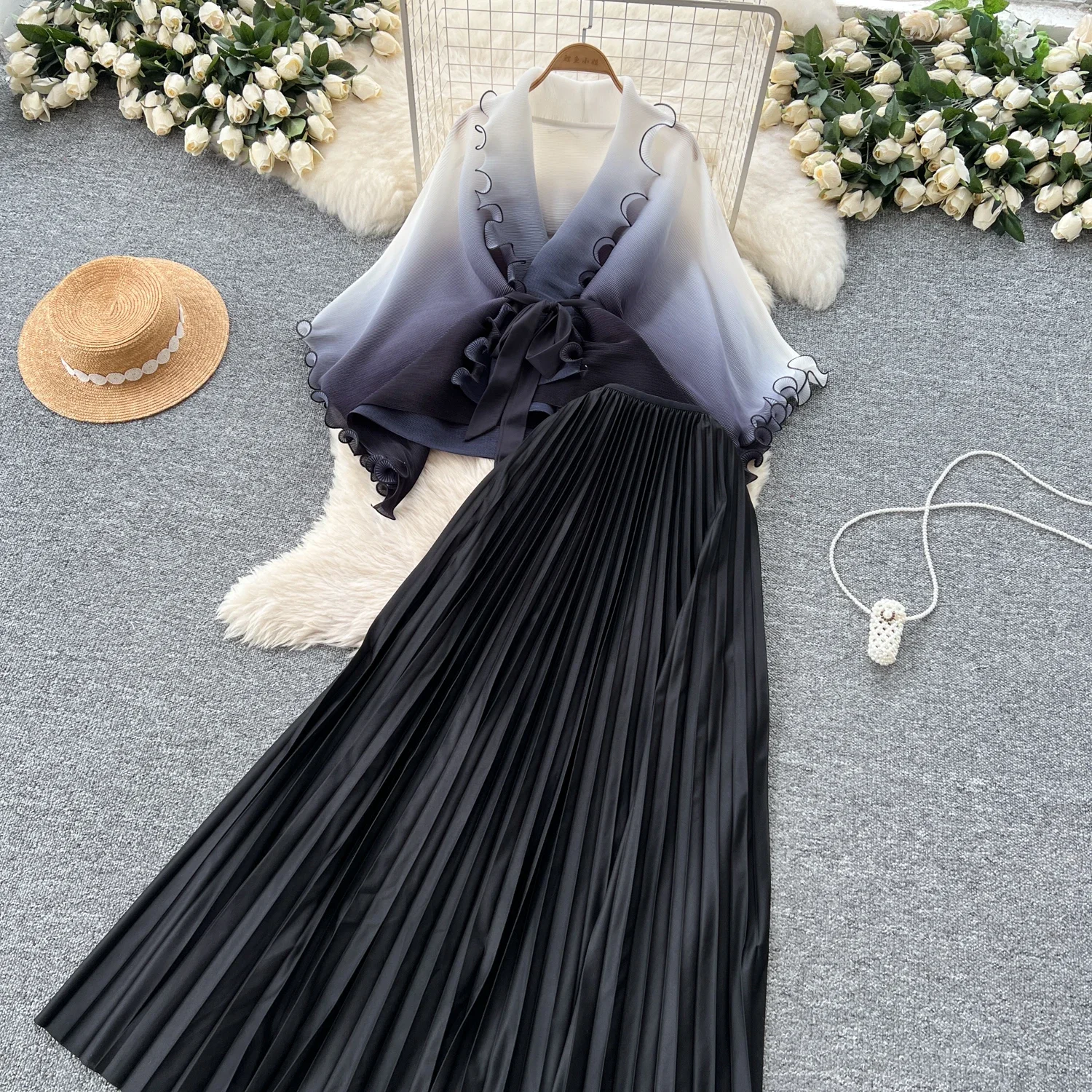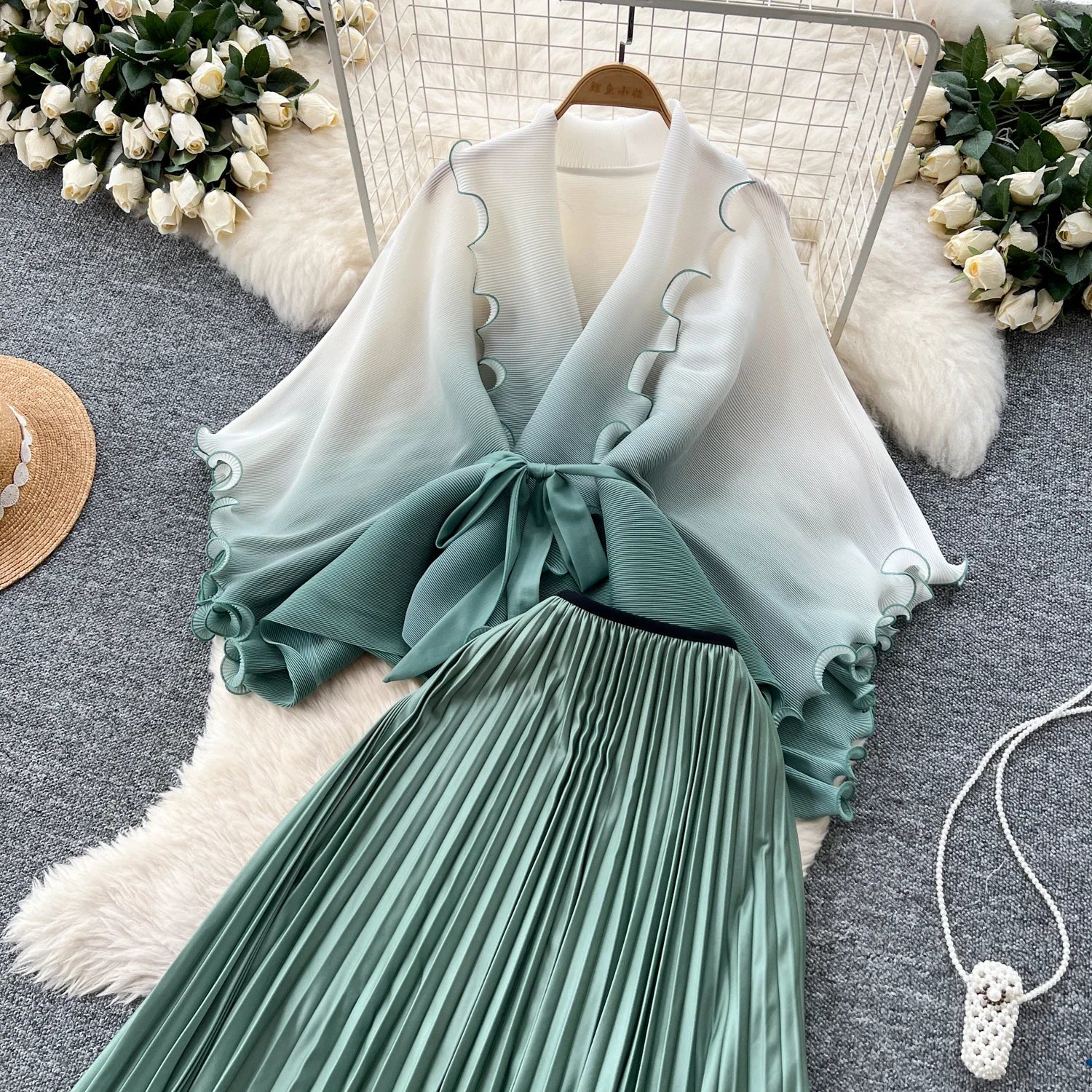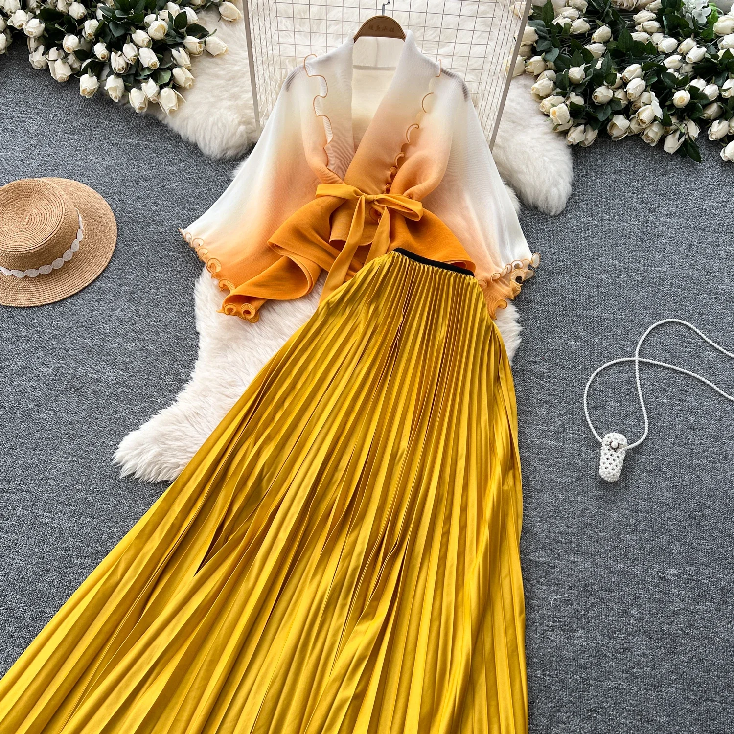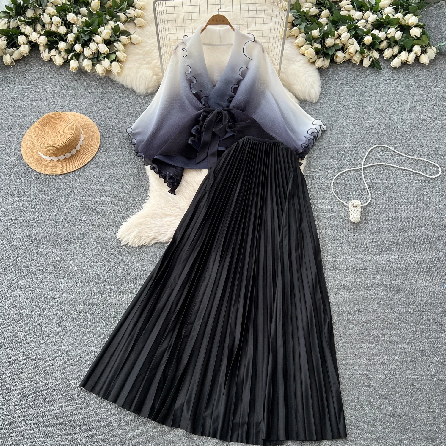 Miyake pli changement progressif couleur bord ondulé costume soleil jupe plissée à la mode et élégant deux pièces ensembles tenues pour femmes