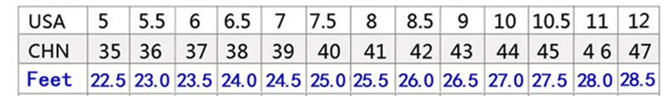 size_info: {"sizeInfoList":[{"length":{"cm":"22.5","inch":"8.86"},"size":"5","vid":-1},{"length":{"cm":"23.0","inch":"9.06"},"size":"5.5","vid":-2},{"length":{"cm":"23.5","inch":"9.25"},"size":"6","vid":-3},{"length":{"cm":"24.0","inch":"9.45"},"size":"6.5","vid":-4},{"length":{"cm":"24.5","inch":"9.65"},"size":"7","vid":-5},{"length":{"cm":"25.0","inch":"9.84"},"size":"7.5","vid":-6},{"length":{"cm":"25.5","inch":"10.04"},"size":"8","vid":-7},{"length":{"cm":"26.0","inch":"10.24"},"size":"8.5","vid":-8},{"length":{"cm":"26.5","inch":"10.43"},"size":"9","vid":-9},{"length":{"cm":"27.0","inch":"10.63"},"size":"10","vid":-10},{"length":{"cm":"27.5","inch":"10.83"},"size":"10.5","vid":-11},{"length":{"cm":"28.0","inch":"11.02"},"size":"11","vid":-12},{"length":{"cm":"28.5","inch":"11.22"},"size":"12","vid":-13},{"length":{"cm":"29.5","inch":"11.61"},"size":"13","vid":-14},{"length":{"cm":"30","inch":"11.81"},"size":"14","vid":-15},{"length":{"cm":"31","inch":"12.20"},"size":"15","vid":-16}]}