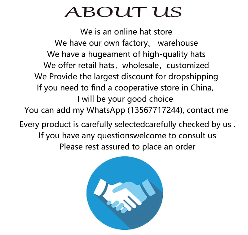 1. Tous les chapeaux de la boutique sont en stock.Les commandes sont expédiées dans l'ordre de paiement, afin que vous puissiez acheter en toute confiance.