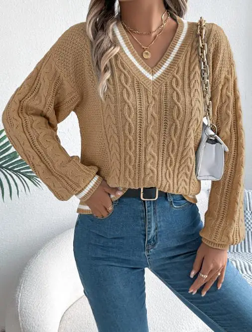 Pull femme 2025 mode Style décontracté automne hiver nouvelle couleur bloquant col en v pâte frite torsion lanterne à manches longues pull