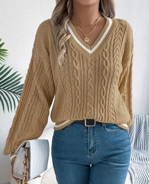 Pull à manches longues pour femme, Style à la mode décontracté, nouvelle couleur bloquant, col en v, pâte frite, lanterne torsadée, 2025, automne hiver