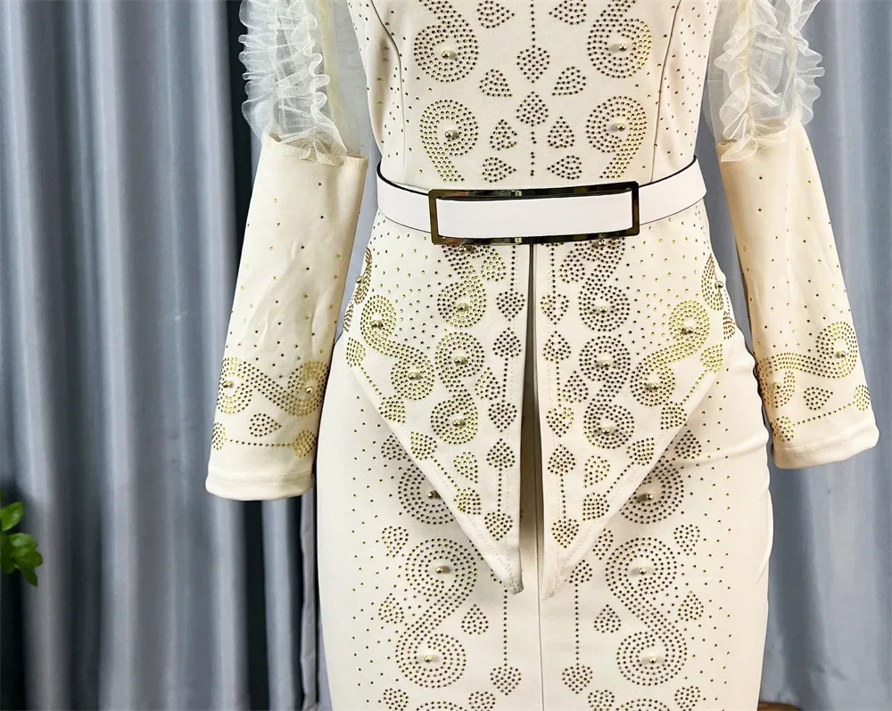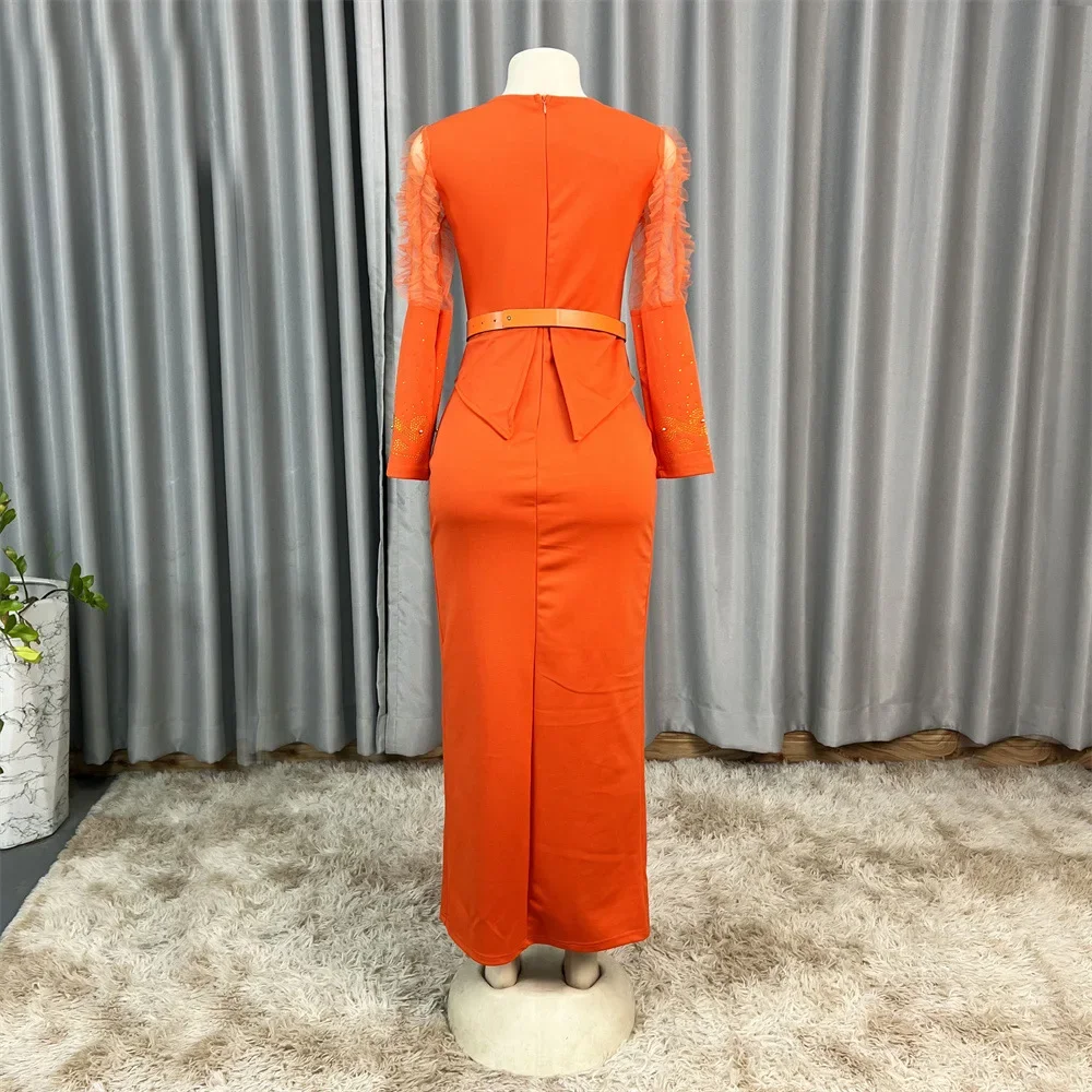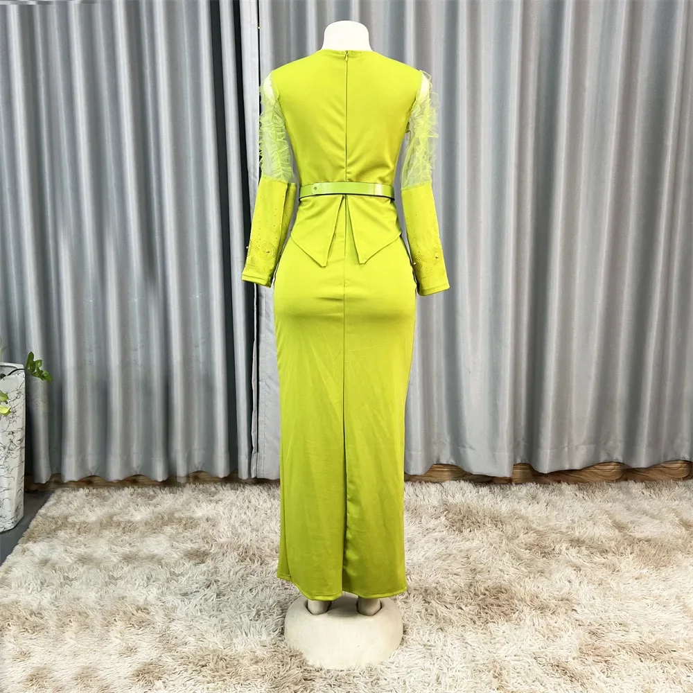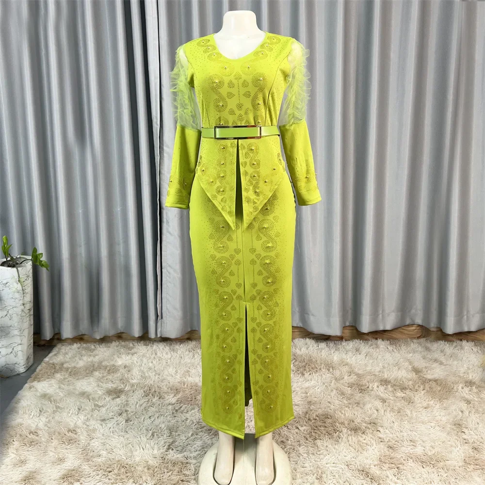 Robe longue africaine à col en v, ornée de strass, manches en maille à bulles, ajustée à la taille, fente latérale, offre spéciale