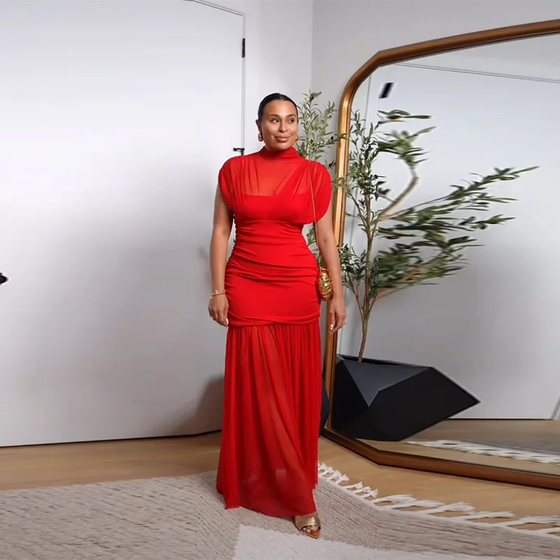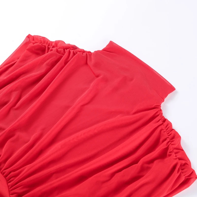 Numéro de Modèle: Red Mesh Patchwork Pleated Long Skirt Dress
