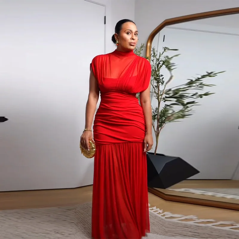 Robe longue de soirée plissée rouge Chic, élégante, manches volantes, maille, Patchwork, Maxi, vacances d'été, plage