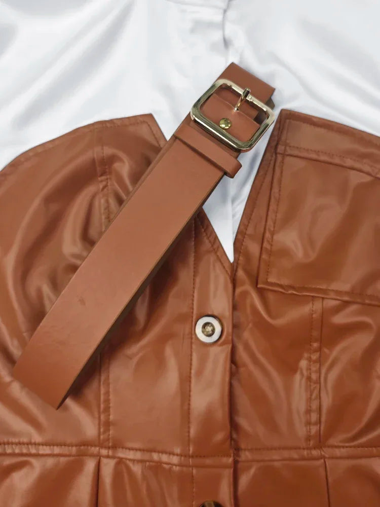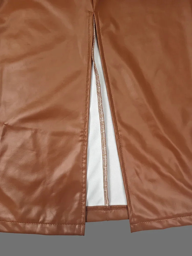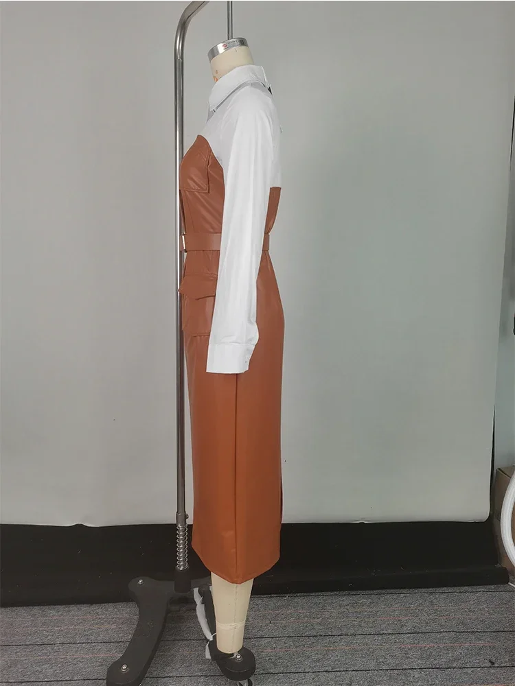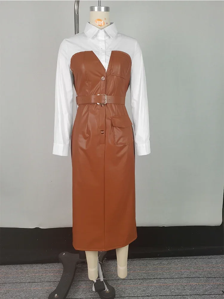 Robe mi-longue à manches longues pour femmes avec boutons, jupe chemise en PU, poche patchwork, ceinture maigre, revers, femme, automne, nouveau, 2025