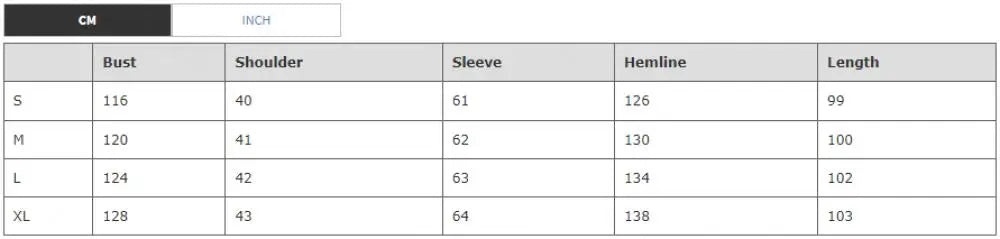 size_info: {"sizeInfoList":[{"length":{"cm":"116","inch":"45.67"},"size":"S","vid":100014064},{"length":{"cm":"120","inch":"47.24"},"size":"M","vid":361386},{"length":{"cm":"124","inch":"48.82"},"size":"L","vid":361385},{"length":{"cm":"128","inch":"50.39"},"size":"XL","vid":100014065},{"length":{"cm":"132","inch":"51.97"},"size":"XXL","vid":4182}]}