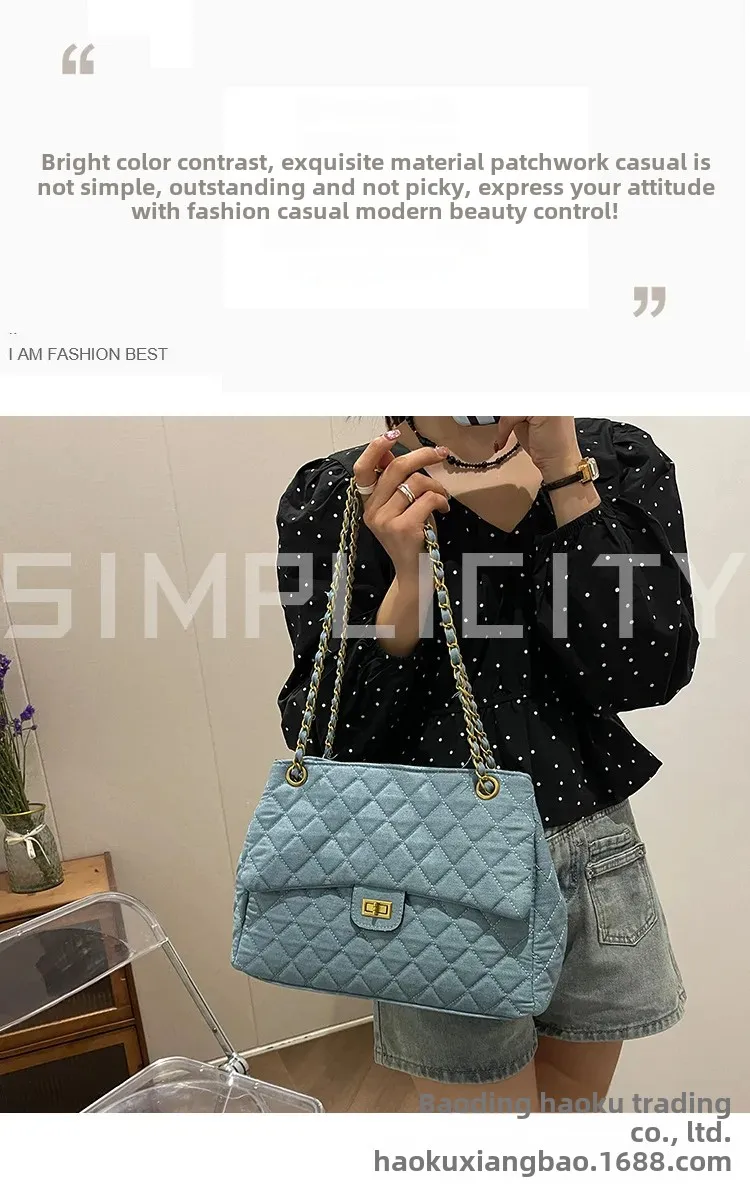 Sac à bandoulière en chaîne en Denim tendance, polyvalent, à motifs de diamants, forme carrée douce, Style minimaliste neutre, Linin en Polyester