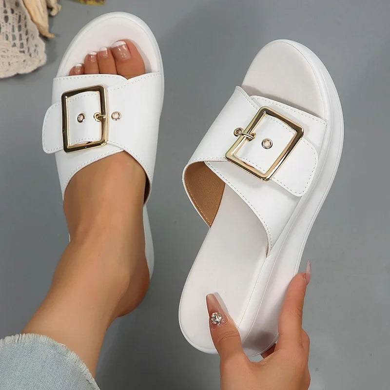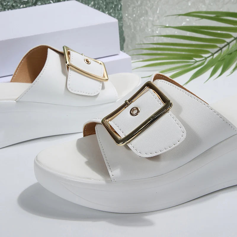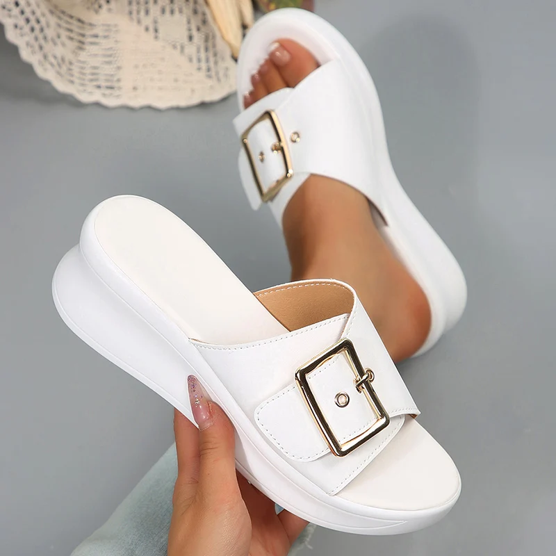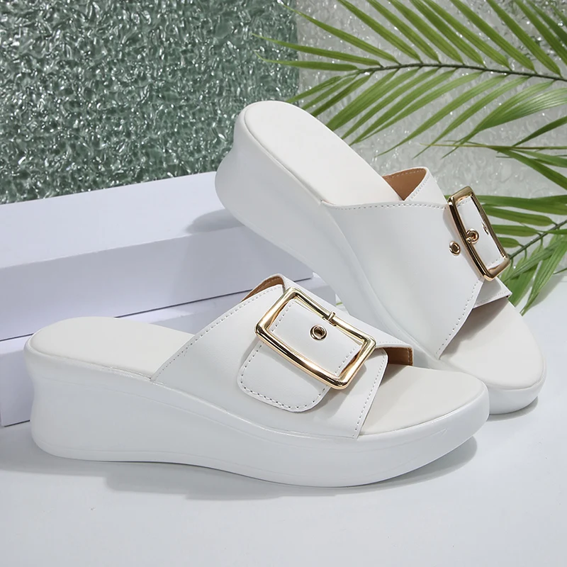 Sandales à talons compensés avec boucle en métal pour femmes, sandales d'été en cuir Pu à fond épais, légères, à talons hauts, pour la plage, 2025