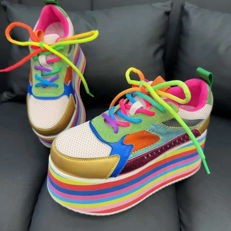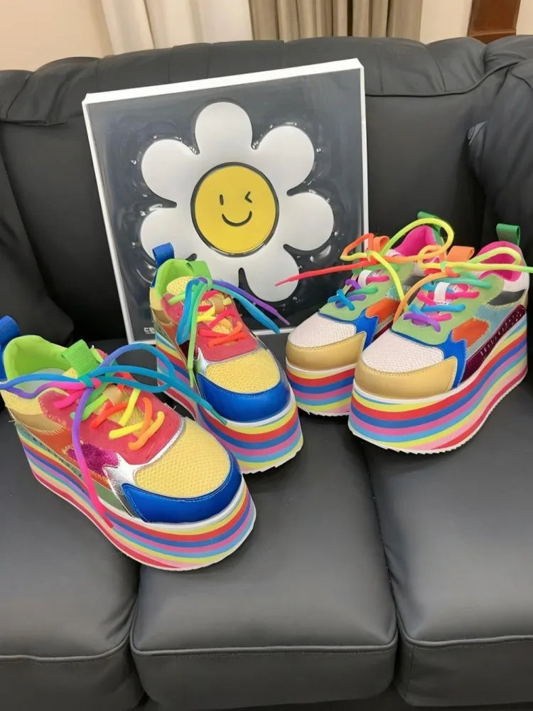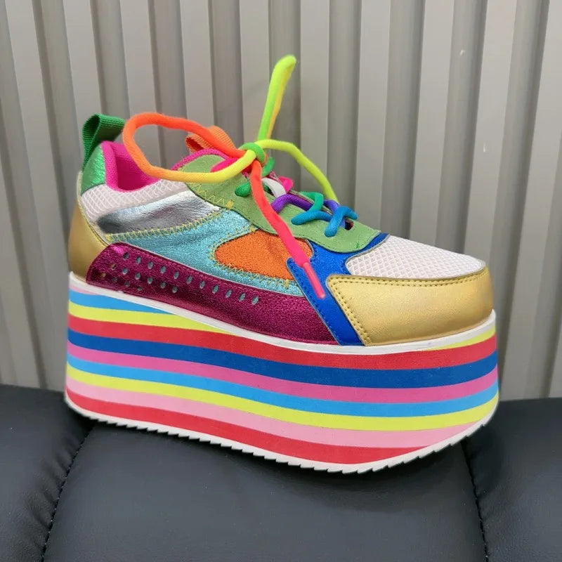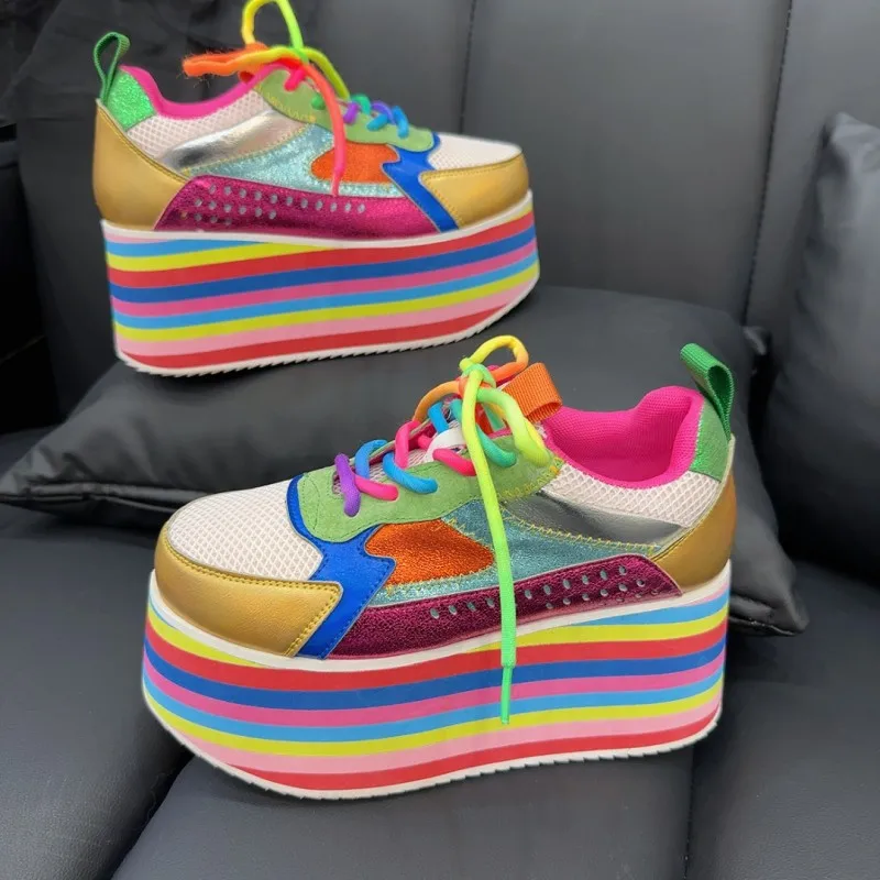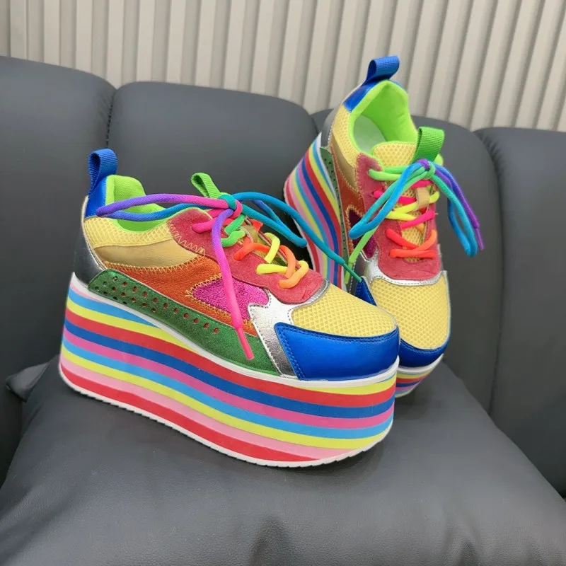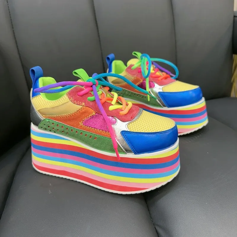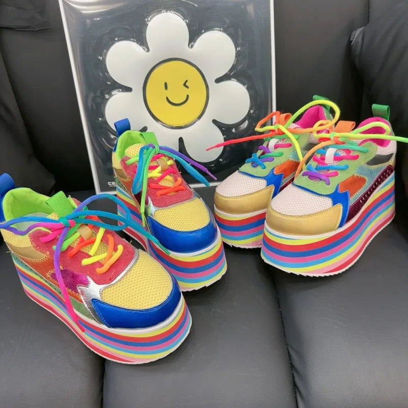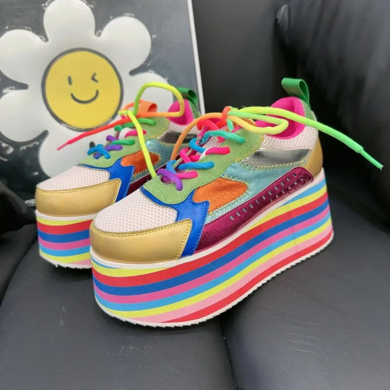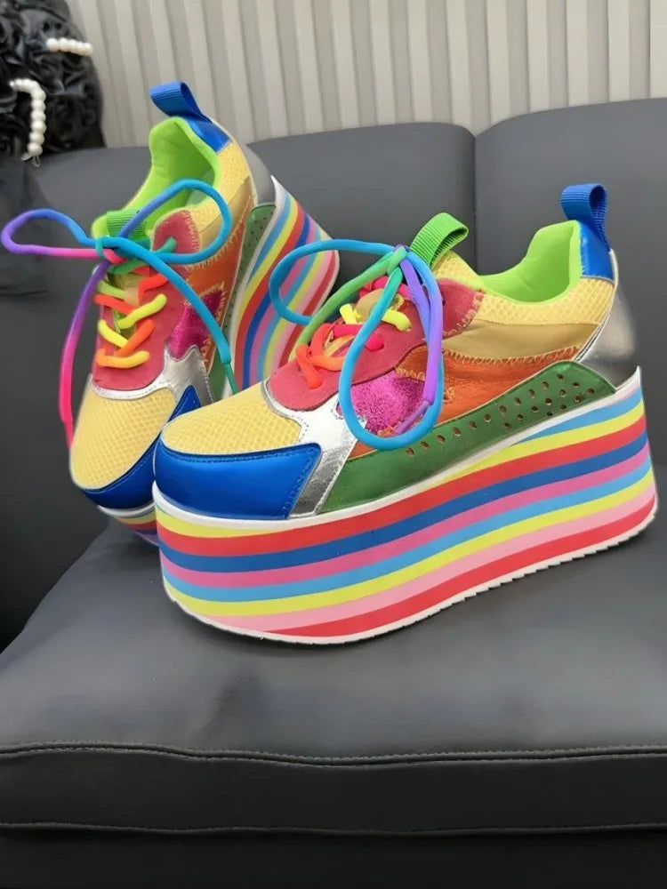 Style de loisirs dames couleur arc-en-ciel maille bout rond plate-forme croisée talons hauts chaussures respirant couleurs mélangées pompes de mode