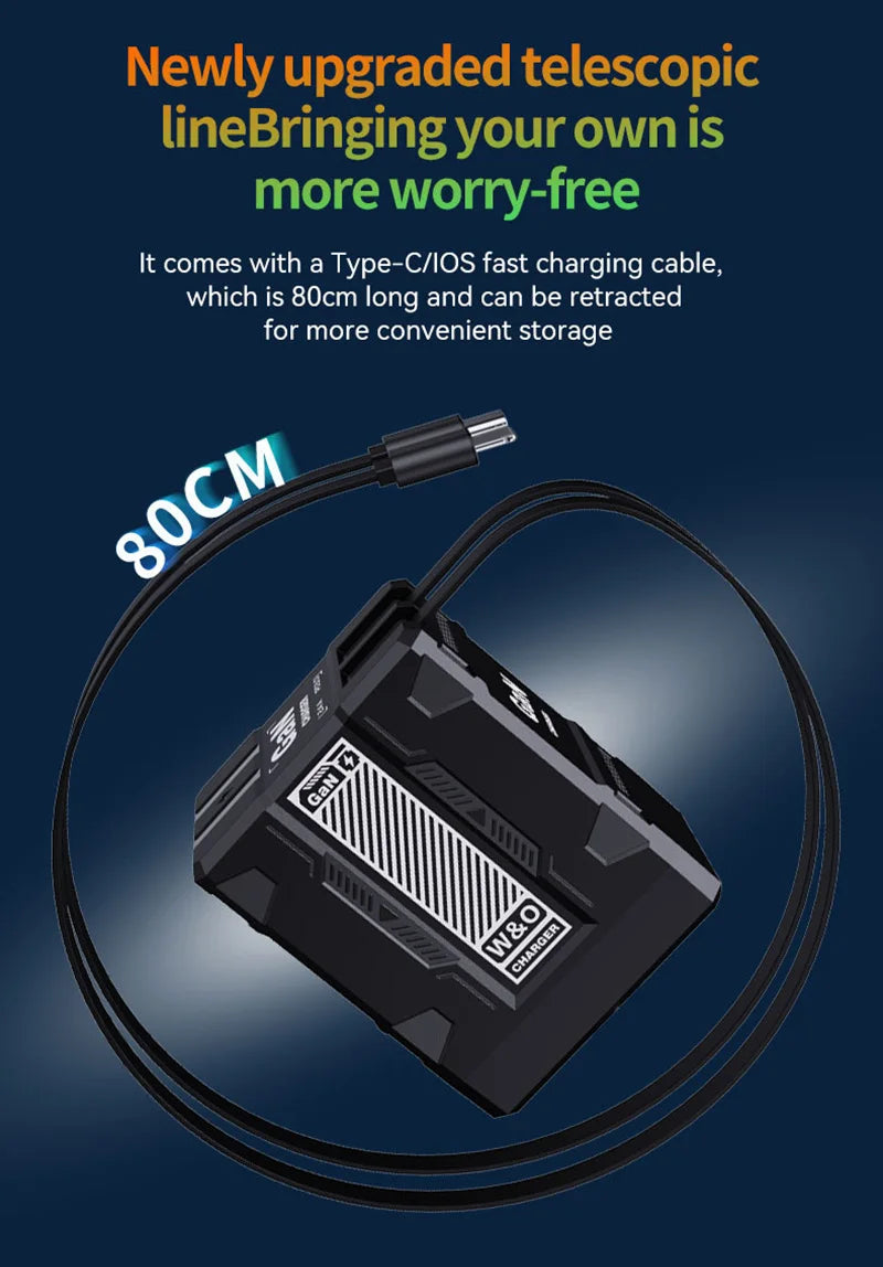 5.*Avec le câble de charge rapide Type-C/IOS, la longueur du câble est de 80 cm, ce qui est plus pratique pour le stockage télescopique.